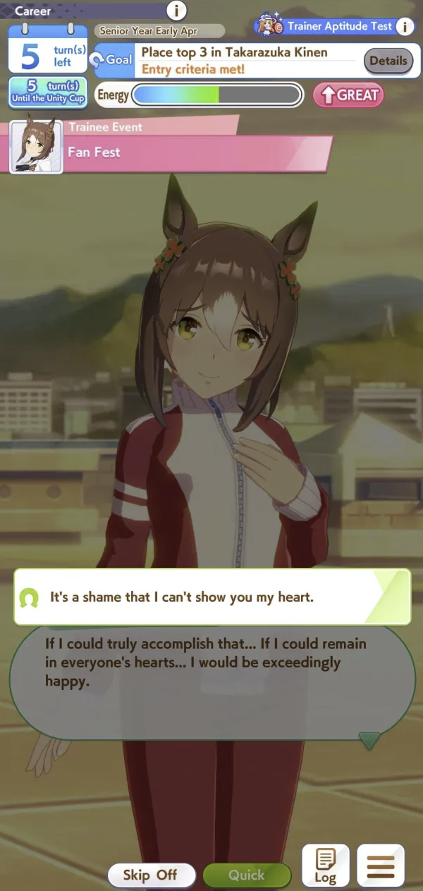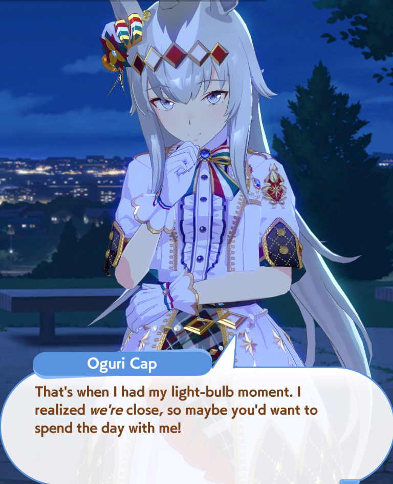 >>554237736It's not the same every time though. The Director has at least two, one with the fan, one with the carrot meat loaf. Otonashi gives stats sometimes, other times just skill points. I used to just estimate around +70 for all three races and the epilogues, but I've realized that's not reliable in Unity like it is in URA.