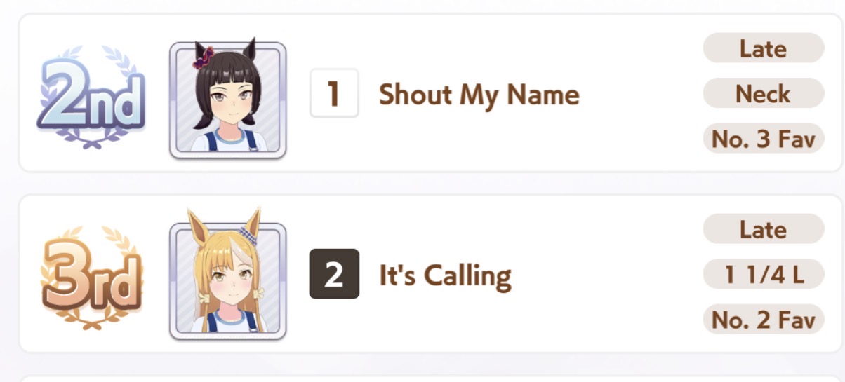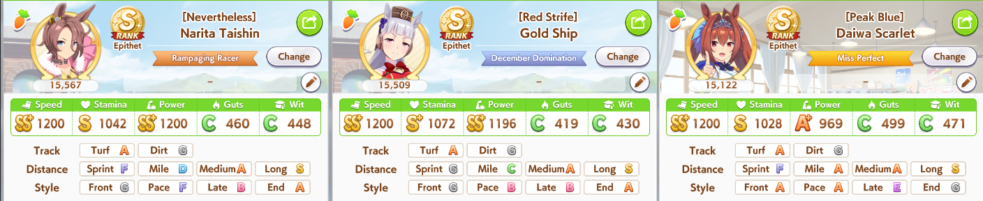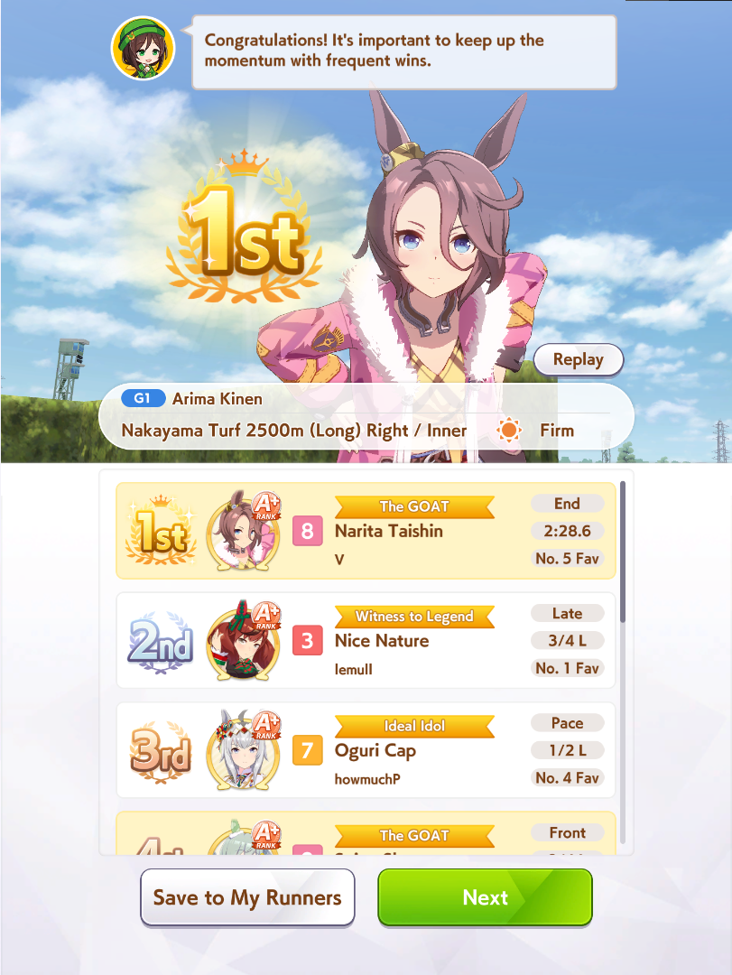 >>554211691Tried Cafe since she's the best STA stat stick I have.Throwing triple fronts (2 reg + oonige) at the Arima Kinen, worked well enough for the previous long.>>554211639A shame they're aids to get.