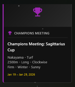 Previous: >>554180467>Global Game NewsLink your account to Cygames iDCurrent Scenario: Aoharu Hai aka "Unity Cup"Current Rate Up Trainee: Christmas Oguri Cap (3* alt), Christmas Biwa Hayahide (3* alt), Fine Motion (3*)Current Rate Up Support Cards: Narita Taishin (SSR), Mayano Top Gun (SSR), Manhattan Cafe (SSR), Inari One (SR)01/19 - Sagittarius Cup - Nakayama Turf 2500m01/22 - Tama 3*+Neicha SSR+Ogurin SSR - Legend Races01/27 - New Beginnings Part 101/29 - NY Opera & Haru 3*+Fuku SSR+Ayabe SSRMid February - Capricorn Cup - Chukyo Turf 1200mhttps://umamusume.com/news/100040/https://pages.snep.pw/uma/anni-skill-changes/>JP Game NewsCurrent Rate Up: Bubble Gum Fellow (3* Alt), Stay Gold (3*), Gentildonna (3*), Orfevre (3*), King Halo (SSR), Satono Diamond (SR)New Scenario "Yukoma Hot Spring" releasedTimeline: https://uma.moe/timelineCygames Webstore: https://webstore.cygames.com/en/umamusume_en/>Thread Clubshttps://rentry.co/umaglobalclublistYou must be E3 (20k points) to join a circle. Apply with /uma/ or /vg/ in your profile or post ID in the thread.>All Guides & Resourceshttps://rentry.org/uma26Game databasehttps://gametora.com/umamusume (Click the gear to switch between JP / global server info)A basic guide for newfagshttps://rentry.org/umaglobalFind networks if your region is blocked from the game or clienthttps://www.umavpn.top/93Seiyuu & Concertshttps://rentry.org/umstUma Texthttps://umareader.idsmile.xyz/
