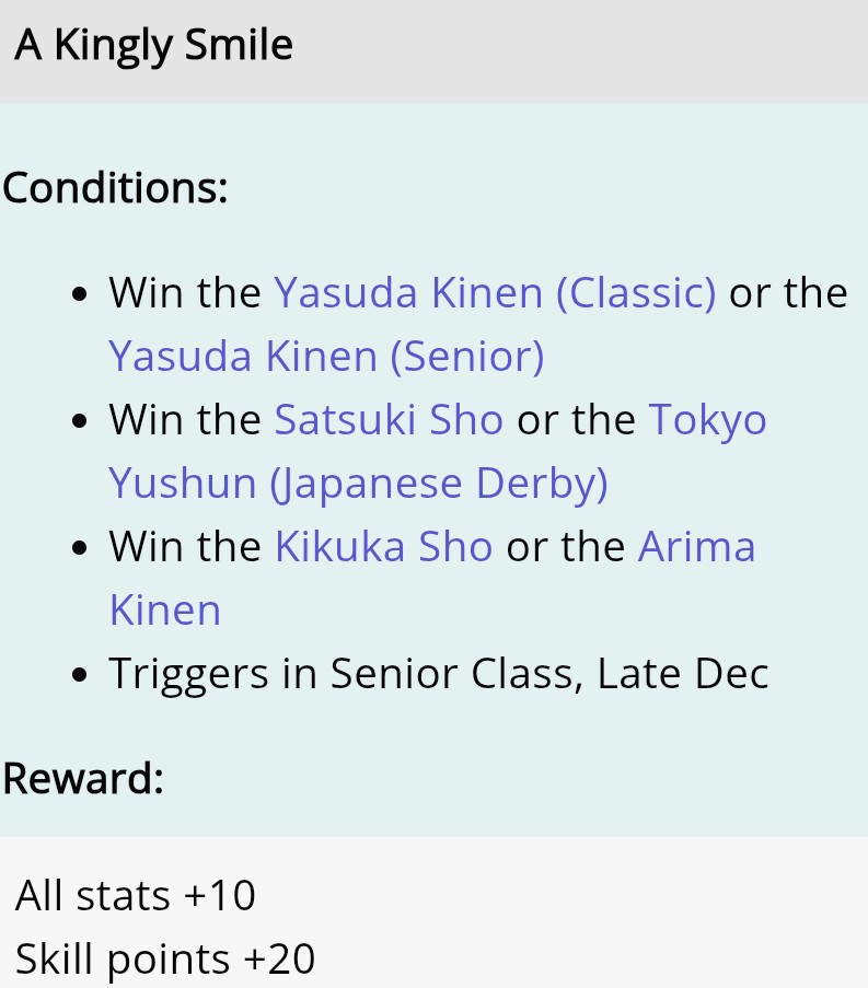 >>554211909just pump the 2 stats it asks for to 800 and buy 2 of the 1200 points skillIt always asks for It's on so that one is free then just use an uma or a card that gets the other