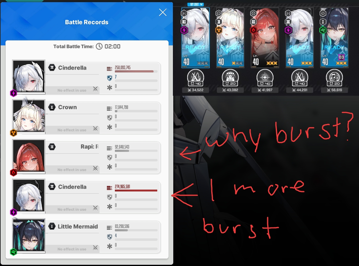 >>554281391You need an electric Nikke (Cindy) to break the elemental QTE shield. You need an ATK buffer (Liter, Red Hood) to break the DEF boosted slippers in a single shot (Helm, RH). You need a healer (Helm) to survive the crystals and lasers if you're not autistic enough to cover every single attack. Try Liter-Crown-Cindy-Helm-RH and use RH's Burst 1 to break the first slipper - if it breaks you've got a decent chance to beat it, it it doesn't then you're fucked