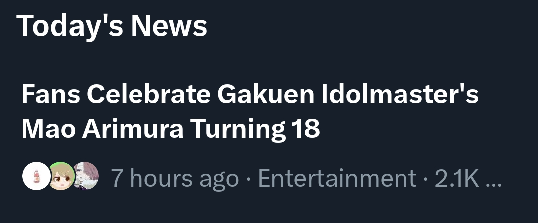 iM@S NEWS ARCHIVE- Archive of >>554070364: archive.is/AIHiX>Gakuen- GK Mao's birthday 2026: >>554173101 >>554173186 >>554173301 - GK Mao's birthday tributes 2026 (including VA/staff tributes): >>554172097 >>554175603 >>554176813 >>554177013- GK Mao's Birthday Mini-Live 2026 setlist: >>554171753- Mao cursors: >>554172794- Nadeshiko finally learned some manners: >>554200336 >>554201057>Million Live- TD BATTLE OF THEATER Round 3 details: >>554146270>Shiny Colors- SC SHHis POP UP SHOP ~Maihime Ayaka~ at JOL Collab Store and MAGNET by SHIBUYA109 photos (Jan 17th): >>554153436 >>554153559- SC 283 Production XXXX Performance XXX= S/N-GUL4R1TY promos (Jan 17th): >>554123946 >>554155045- SC CollaboFes Event on Jan 20th: >>554184498
