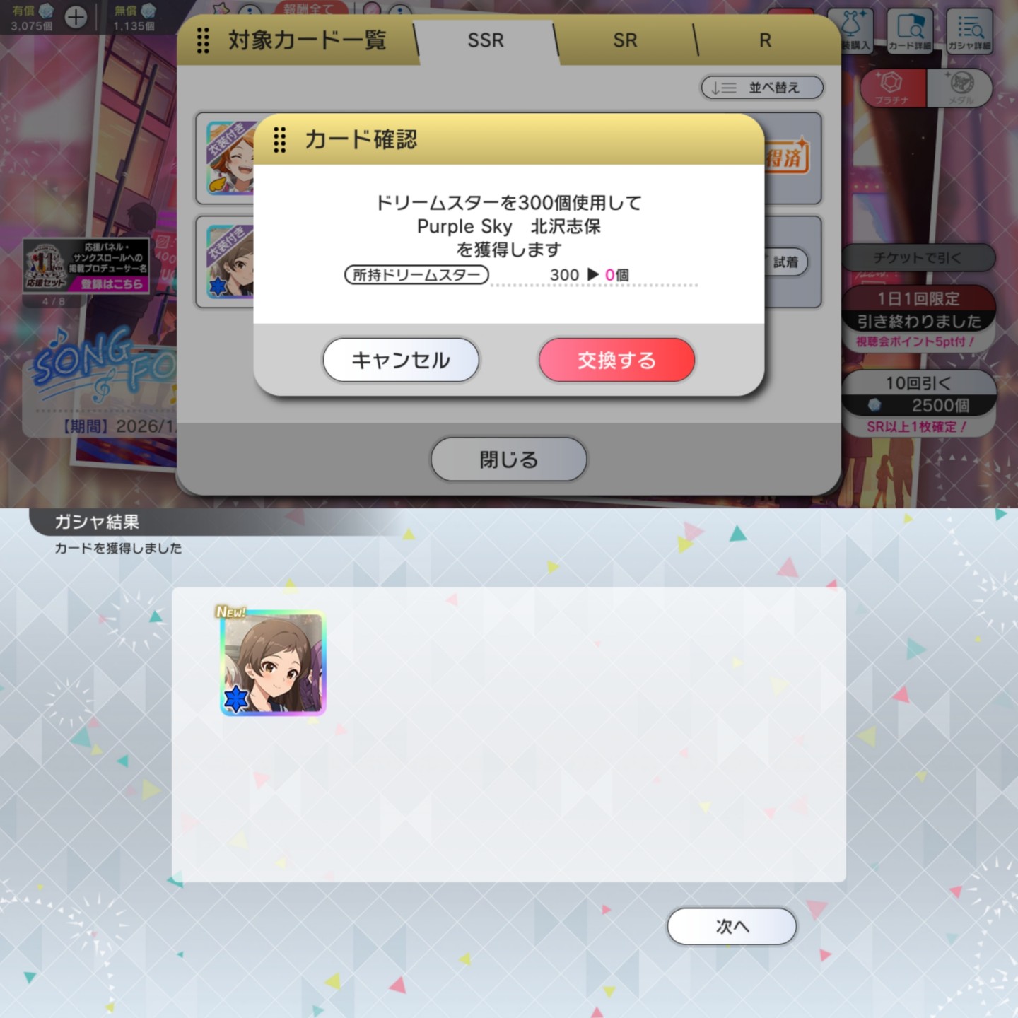>>554283490SHINY COLORS>>Event01/09 - 01/20 11:59AM JST New Year Campaign 2026 Special Mission01/09 - 01/20 11:59AM JST Produce "Winter Snow Box" (SR Kaho)01/20 3PM JST - 01/30 Rerun Scenario "Time of Good-byes"01/20 3PM JST - 01/30 Collabo Fes01/09 - 01/30 "2nd Shiny Act"01/01 - 01/31 New Year Campaign 2026>>>Gacha01/09 - 01/20 11:59AM JST "Dazzling Sky Journery" (SSRP Mano, SSRS Madoka)01/09 - 01/20 11:59AM JST Rerun "Walking Under the Starry Night" (URP Rinze, URS Tenka)>>Has Normal and Paid Jewels Only version2025/12/27 - 01/20 11:59AM JST #SCFantasy "Returning Princess Knight" (SSRS Fuyuko)01/01 - 01/20 11:59AM JST Prelude Collection (SSRS Luca)01/01 - 01/20 11:59AM JST "Don't Think, Touch" (URP Hana, URS Mikoto)01/09 - 01/30 #SCFantasy "Reckless Holy Lynching" (SSRS Kiriko)>>Paid Jewels Only01/01 - 01/20 11:59AM JST New Year! Twilights Collection & Parallel Collection & My Songs Collection & Limited01/09 - 01/20 11:59AM JST New Year Campaign 2026 SSR Up to 2X Chance!SONG FOR PRISM>>Event01/21 JST~ - 6th Technical Challenge Cup2025/12/31 - 01/28 11:59PM JST Season 27 "Request?" (SSR Hana)2025/12/20 - 01/31 Portrait Focus Mode01/10 - 02/20 Episode Zero Chapter 5 Mission>>>Gacha>>Has Normal and Paid Jewels Only version01/10 - 01/21 11:59AM JST "A Wish on the First Sunrise Glow" (3* Lim Nichika, 3* Haruki, SSR Lim Nichika, SSR Haruki)01/16 - 01/22 11:59PM JST Happy Birthday (3* Yuika)2025/12/31 - 01/31 "PJ: REFRAC7IONS - Sonic Heart (and Signal)" (3* Lim Hinana, 3* Lim Meguru, 3* Lim Kaho, 3* Lim Kogane)