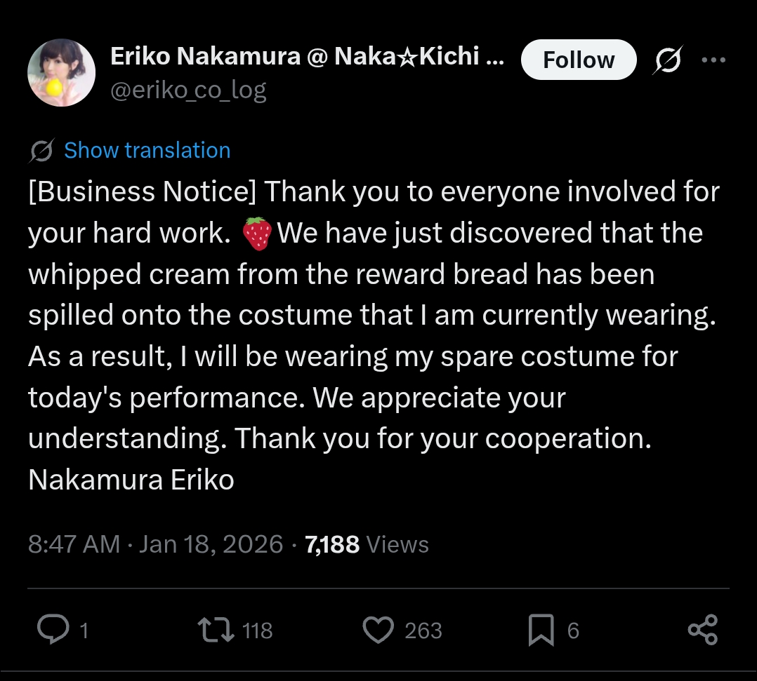 https://x.com/TomoriManaka/status/2012857827304329252Oh yeah, Manaka did the narration for the DJ event this weekend.