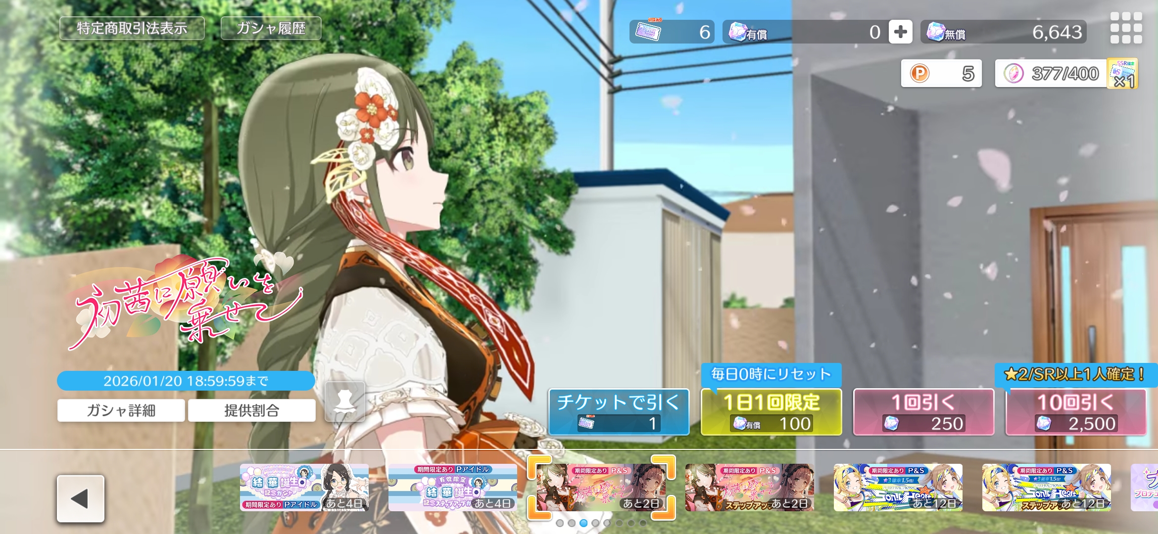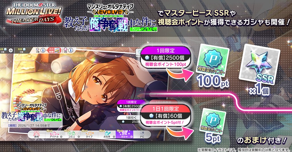 Helpful Linkshttps://pastebin.com/Z70CGAsNSTARLIGHT STAGE>>Event01/01 - 01/31 11:59PM JST SSR Recruitment Challenge03/23 12AM JST - 04/05 LIVE Carnival ~2026 Spring~>>Gacha09/22~ Platinum Audition Once-a-day Free 1 Roll01/15 - 01/24 11:59PM JST Premium Audition01/15 - 01/24 11:59PM JST Dominant01/15 - 01/24 11:59PM JST Limited Skill PickTHEATER DAYS>>Event01/18 - 01/25 Platinum Star Tour Bingo ~Especially Angel~ (Fuka, Mami)01/09 - 01/25 Tokimeki Off-shot POP UP SHOP in Bic Camera Campaign01/16 - 02/01 Jellyfish Rhythm POP UP SHOP Campaign2025/07/17 - 06/28 8th Special Training2025/07/23~ 52 Weeks Continuous CD Release Campaign >>Gacha01/18 - 01/27 Monthly Alternative [EVOLVE] "About the Students Fighting Over Me" (Yukiho, Kaori, Julia, Mizuki, Umi)GAKUEN>>Event01/05 - 01/21 4:59AM JST Contest Season 3701/16 - 01/26 Juo Kunio's Idol Improvement Month01/16 - 01/27 Affection Boost Campaign01/01 - 02/01 New Year Campaign Produce Improvement Week2025/12/26 - 02/16 Producer Ranking Season 1>>Gacha01/16 - 01/27 Ittai Itsu kara (Temari)2025/12/26 - 02/01 TV CM Commemoration