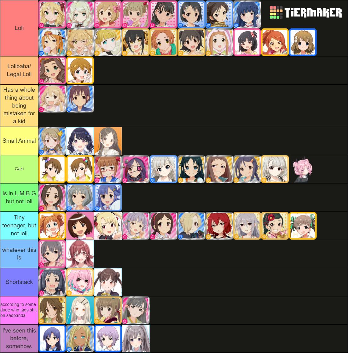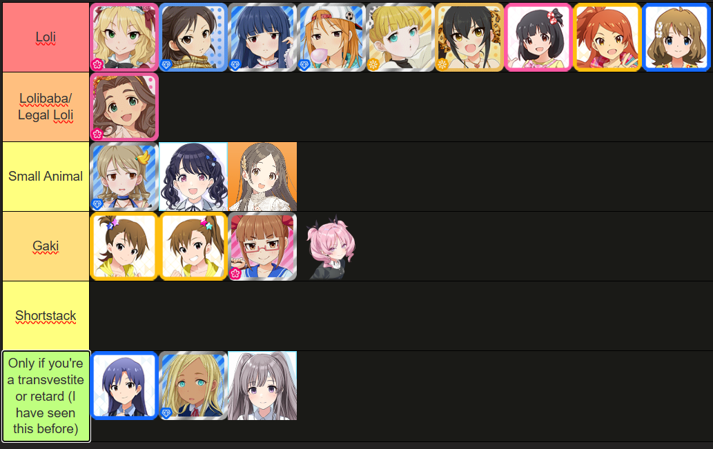 >>554278934Yuuki and kaho should be long lolis, Shorstacks should be changed to Oppai loli, If you're going to add Riamu, might as well add all the idols with 80+ bust but less than 150cm in height (like Nana) also made another tier for BFHA (Big for her age) where you can add Haa chan.