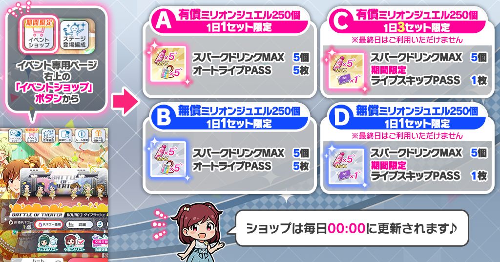 >>554288996https://x.com/imasml_theater/status/2012767408797405513MAX Drinks, Auto-Live Passes and Skip-Live Passes are available from the event shop.