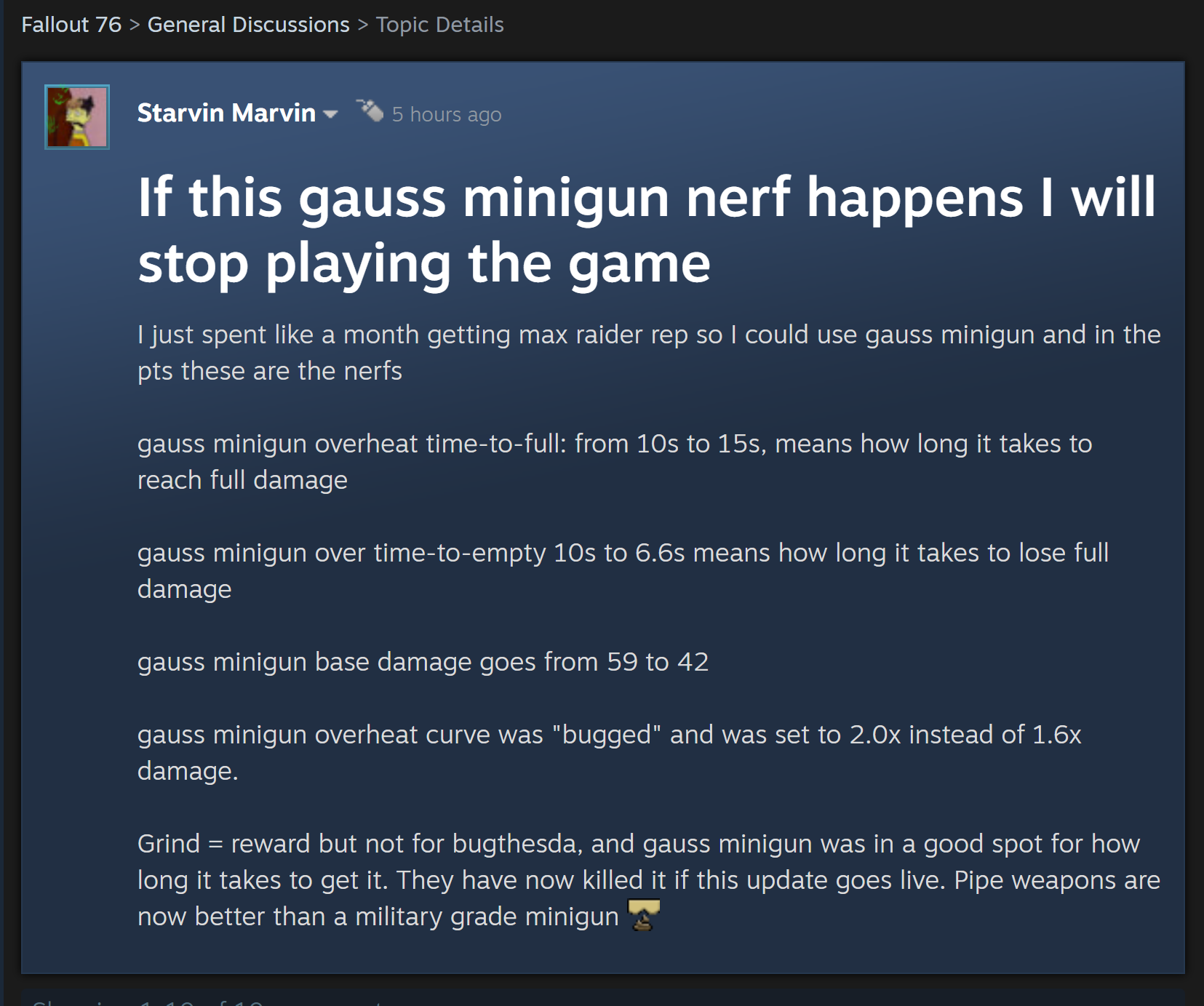 >>554450704don't know about you but I still need to craft ammo for certain weaponsGattling Gauss Minigun is still impractical for anything outside specific encounters, so is light machine gun, wildly inefficient ammo wise even with controlled bursts you are losing ammo I also don't miss using the ammo converter or squatting on ammo factory workshop