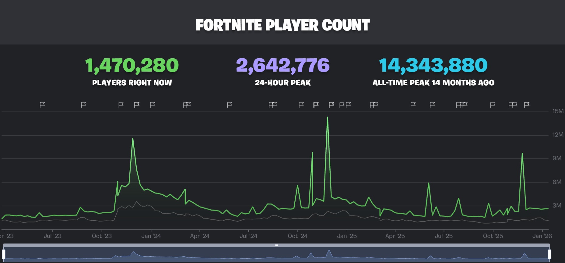 >>554238173Brainrot is artificially inflating numbers. You need to check the average player count to get a better reading.>January 2024 Average - 2,344,475>January 2025 Average - 1,776,065>January 2026 Average - 1,231,452