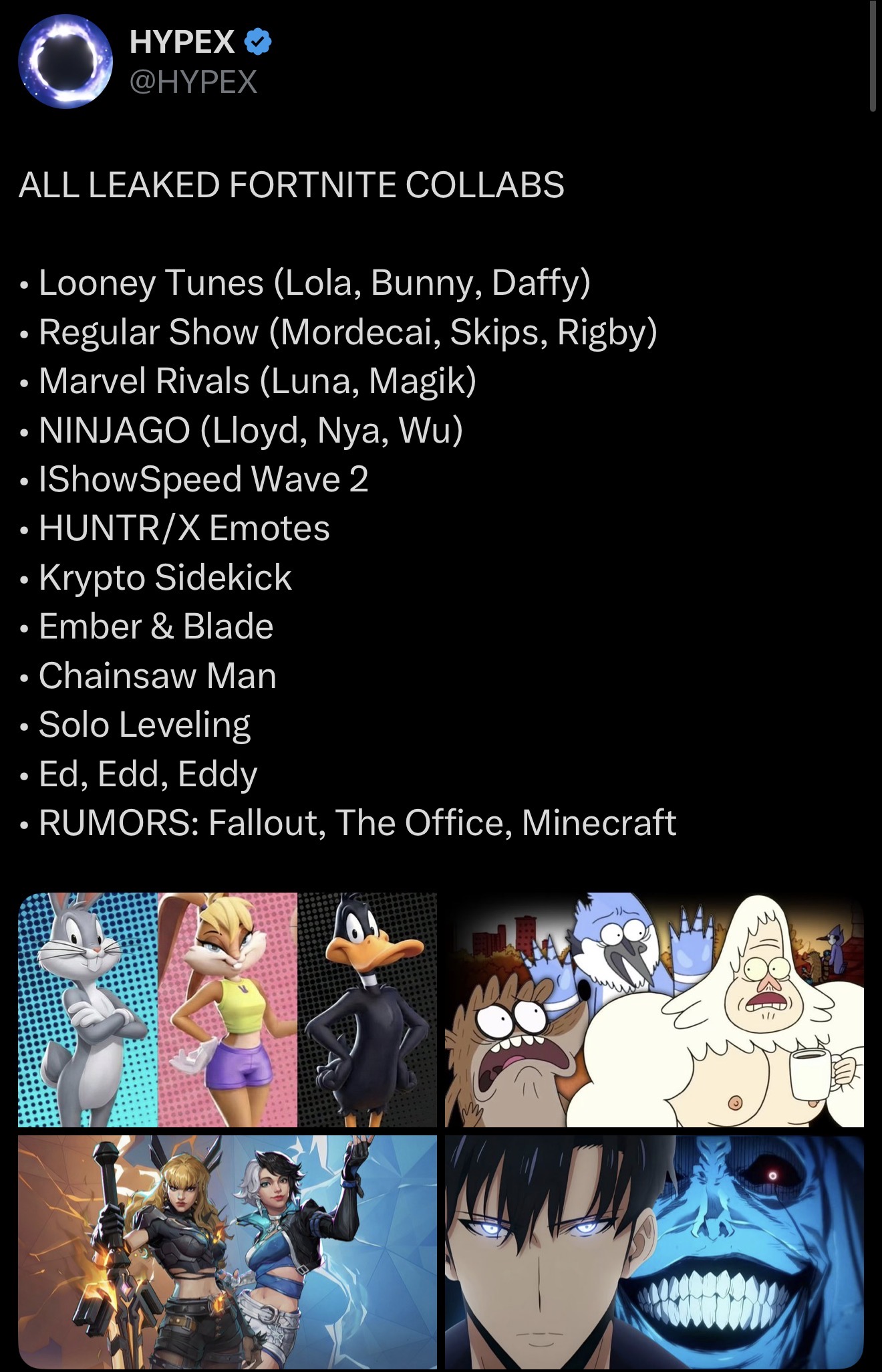 >>554338152Disney is clearly withholding stuff for the release of Disney Fortnite at this point. Outside of the miniseasons, the only disney stuff I remember this year was avatar and the groot sidekick (and probably some random marvelslop).Meanwhile WB is about to launch their new mode apparently so they're going all in, fuckin adding Ed Edd n Eddy of all things out of nowhere