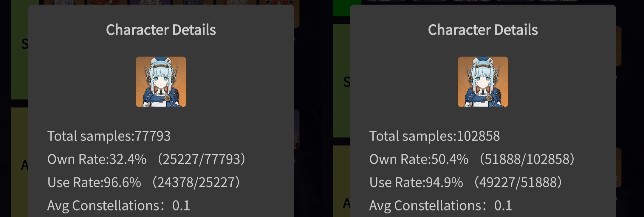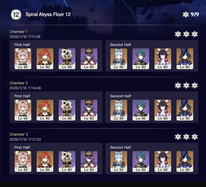 >Too shy to post or just wanted to make sure I get your clear?>Can't solve captcha to post?Send them to me privately here:https://form.jotform.com/253493679126468---------Luna IV 2026-01-16 Spiral Abyss StatisticsSample size: 154 (4/gig/, 8/gig/ and /gigvmg/)Finalized (draft): 2026-01-17Character Usage (List view):https://files.catbox.moe/lqtyc0.pngOther Statistics:https://files.catbox.moe/m6ddun.png---------Congratulations to these anons for being:"4/gig/'s Top 10 SOVLFVL clears of Spiral Abyss 2026-01-16 Luna IV"#1. Clear #31 - >>554034203 - 917 points#2. Clear #58 - >>554049071 - 916 points#3. Clear #80 - >>554067965 - 914 points#4. Clear #38 - >>554038504 - 908 points#5. Clear #118 - >>554095160 - 902 points#6. Clear #106 - >>554082418 - 897 points#7. Clear #71 - >>554059003 - 891 points#8. Clear #76 - >>554062932 - 885 points#9. Clear #109 - >>554086232 - 872 points#10. Clear #111 - >>554087760 - 868 points(still running and may be subject to change)Leaderboard: https://files.catbox.moe/v5q89q.png---------How is the ranking tabulated?Every submissions get 1000 points as default grade,then the grade will be reduced based on voting data of this poll(Vote if you haven't/ Change your vote:https://strawpoll.com/B2ZB9wmqAgJ | Columbina & Zibai Options added)>Check if you can edit your votesSubmissions with similar grade will then be ranked by the order of submission time(earlier submission gets higher rank)---------I'm still collecting, anons.Feel free to post your clear when you're done.