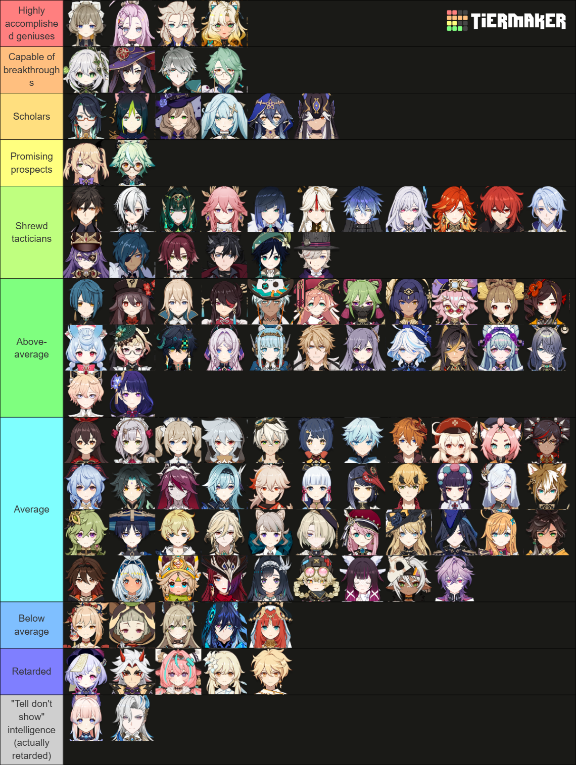 >>554273390>there exists no way to correctly measure all "forms of intelligence"Never claimed that, irrelevant. >the TCG is a great measure of some forms of intelligenceCard games can measure intelligence, the point is that winning at a card game is not a good enough measure of intelligence to excuse Kokomi from disaster-classes such as blindly trusting her anonymous supplier (later revealed to be the Fatui), causing her army to be decimated from within by Delusions, or sending four people straight into Tenshukaku and just hoping it works out. The fact that it actually does work out just contributes to the discrepancy between her reputation and the way the player perceives her.No amount of personal attacks or frantic assumptions about me will change this btw. You do not come across as more intelligent by waxing poetic about irrelevant concepts and constantly belittling your conversation partner. Kokomi's actions belie her reputation in the story.