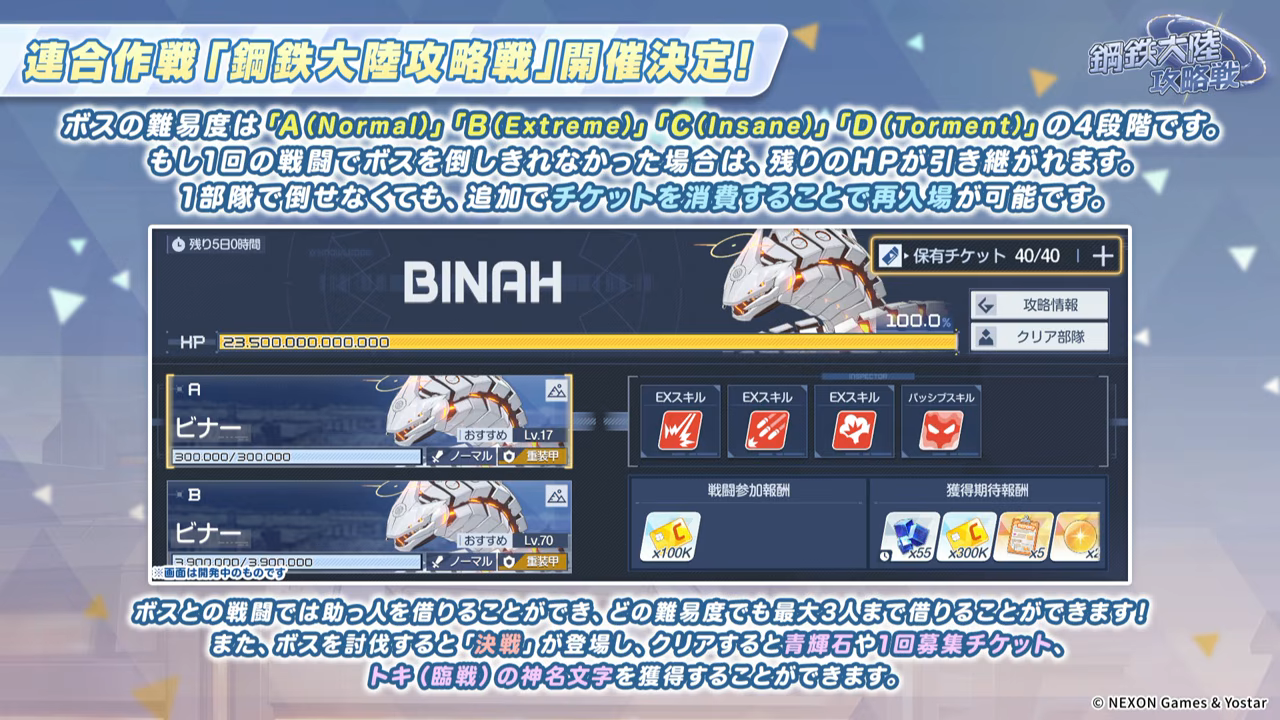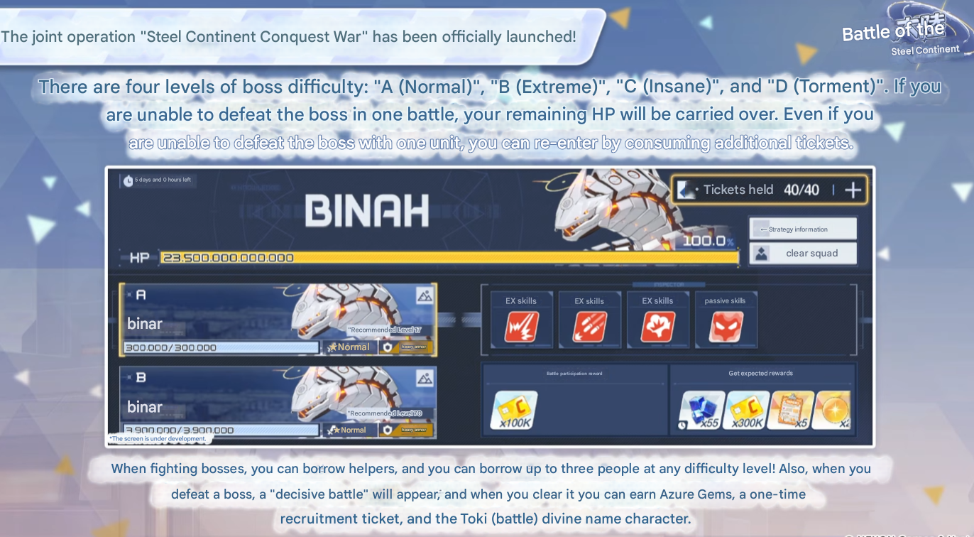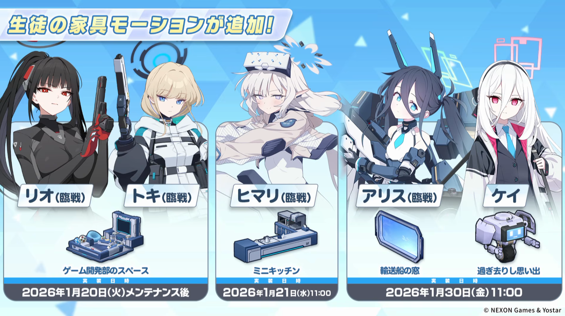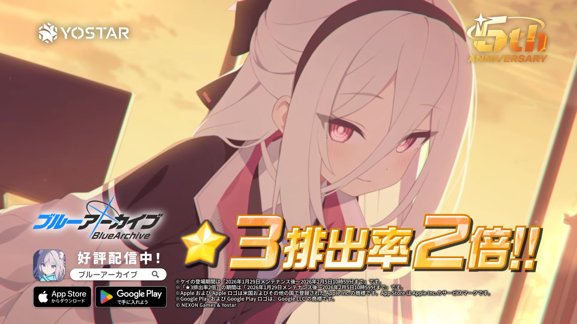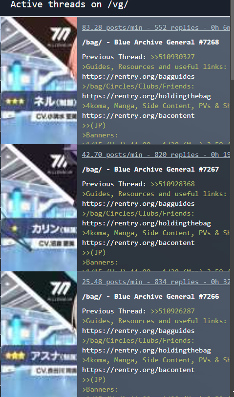 Previous Thread: >>554266005>Guides, Resources and useful links:https://rentry.org/bagguides>/bag/Circles/Clubs/Friends:https://rentry.org/holdingthebag>4koma, Manga, Side Content, PVs & Shortshttps://rentry.org/bacontent>>(JP) – JST>Banners:>1/7 After Maint – 1/20 10:59KisakiReijoYuuka (Track) (Limited)Mari (Track) (Limited)>5th Anniversary Livestream:Day 1: https://www.youtube.com/live/mdafTit0lTA – 1/17 10:00 – 18:00Day 2: https://www.youtube.com/live/kgCwc2EHDgY – 1/18 10:00 – 18:00>News:5th Anniversary Website: https://5th-anniversary.bluearchive.jpPatch notes: https://bluearchive.jp/news/newsJump/618>Events:The Senses Descend – 1/7 After Maint – 1/20 10:595th Anniversary Countdown Login Bonus Event – 1/13 4:00 – 1/20 3:59>Content:Grand Assault: ShiroKuro (Urban – Torment w/Special & Elastic Armor) – 1/14 11:00 – 1/20 3:59Limit Break Assault: The Fury of Set (Field – w/Light Armor) – 12/25 11:00 – 1/20 3:592x Scrimmage/Commission – 1/14 4:00 – 1/20 3:59>>(GLOBAL) – UTC>Banners:>1/13 After Maint – 1/27 1:59EriKanoe>News:Patch notes: https://forum.nexon.com/bluearchive-en/board_view?thread=3336837>Events:We Are the Occult Investigation Society! Ancient Spells and Mysteries – 1/13 After Maint – 1/27 1:59My Office: https://bluearchive.nexon.com/user/myoffice>Content:Total Assault: Perorodzilla (Field) – 1/20 2:00 – 1/26 18:59Joint Firing Drill (Shooting) – 1/27 2:00 – 2/2 18:59Limit Break Assault: Chokmah (Field – w/Special Armor) – 1/14 2:00 – 2/9 18:592x Bounty – 1/12 19:00 – 1/19 18:592x Account EXP – 1/16 19:00 – 1/18 18:592x Normal – 1/19 19:00 – 1/26 18:592x Account EXP – 1/23 19:00 – 1/25 18:592x Lesson/Scrimmage – 1/26 19:00 – 2/2 18:59