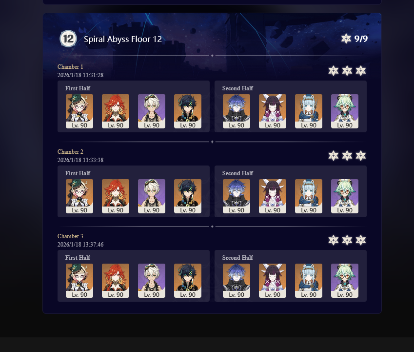 >Too shy to post or just wanted to make sure I get your clear?>Can't solve captcha to post?Send them to me privately here:https://form.jotform.com/253493679126468---------Luna IV 2026-01-16 Spiral Abyss StatisticsSample size: 154 (4/gig/, 8/gig/ and /gigvmg/)Finalized (draft): 2026-01-17Character Usage (List view):https://files.catbox.moe/lqtyc0.pngOther Statistics:https://files.catbox.moe/m6ddun.png---------Congratulations to these anons for being:"4/gig/'s Top 10 SOVLFVL clears of Spiral Abyss 2026-01-16 Luna IV"#1. Clear #31 - >>554034203 - 917 points#2. Clear #58 - >>554049071 - 916 points#3. Clear #80 - >>554067965 - 914 points#4. Clear #38 - >>554038504 - 908 points#5. Clear #118 - >>554095160 - 902 points#6. Clear #106 - >>554082418 - 897 points#7. Clear #71 - >>554059003 - 891 points#8. Clear #76 - >>554062932 - 885 points#9. Clear #109 - >>554086232 - 872 points#10. Clear #111 - >>554087760 - 868 pointsLeaderboard: https://files.catbox.moe/v5q89q.png---------How is the ranking tabulated?Every submissions get 1000 points as default grade,then the grade will be reduced based on voting data of this poll(Vote if you haven't/ Change your vote:https://strawpoll.com/B2ZB9wmqAgJ | Columbina & Zibai Options added)>Check if you can edit your votesSubmissions with similar grade will then be ranked by the order of submission time(earlier submission gets higher rank)---------I'm still collecting, anons!Feel free to post your clear when you're done!