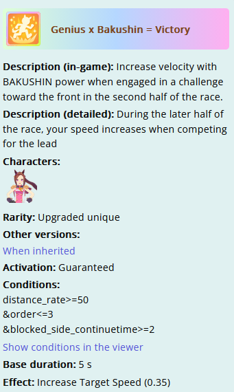 >>554300161mmmm... nyobakushin ult always -always- procs, mayano's is tied to the last second of the race, bakushin is the whole later half of the race and if someone tries to pass her, she bakushins away, it usually procs right before A&S activation range making her a good blocker for that skill