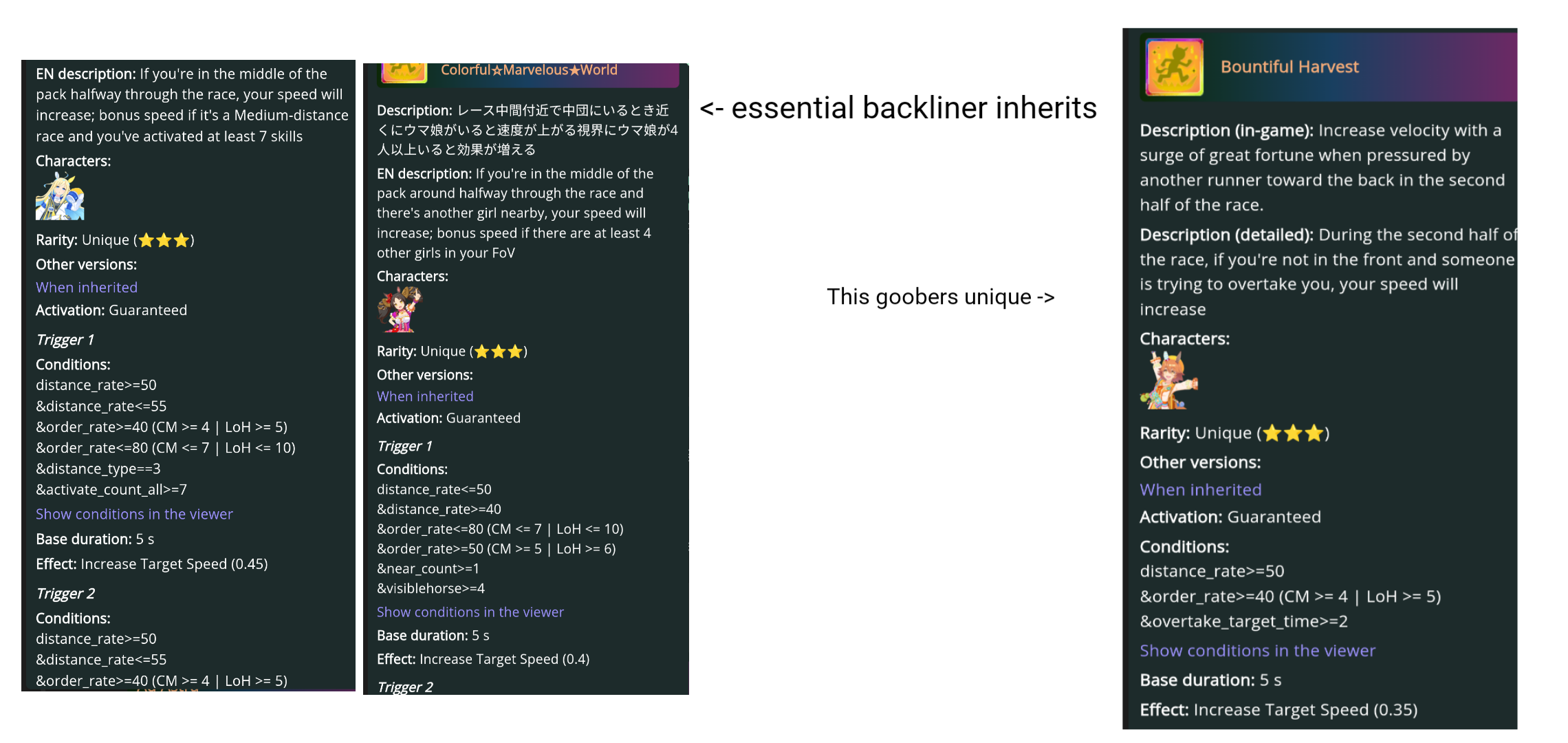 >>554300327Have you actually played Bakushin in CM? Because I have played Mayano that has the same blocked_side_continuetime>=2 condition. Two fronts and that other front might be lagging behind, triple front is the only way to secure skills like this proc consistently. Mayano's unique is harder to proc even with triple front because most of the tracks we have so far has the final corner in the late-race meaning everyone is already zooming out of position, there's no one for her to leech off of.
