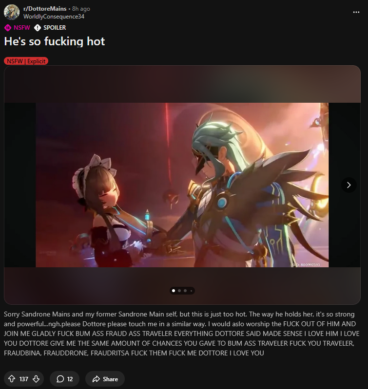>>554328207gorou is for some reason timid around [playable woman character names here] like kokomi but especially for yae miko cause likely jap humor of dommy mommy character always teasing twinks or shotas.So she just teases him a shit ton and because he's basically a femboy with the way he anonymously helps out the readers for some reason, why not tease more with a female version of him and now even the gullible [musclehead character here] (itto, or for a more american example if you're boomer Johnny bravo) is madly in love with female gorou/Ms.Hina only for nobody except yae gorou kokomi and (You) the player knowing it's obviously gorou doing it all, but the joke is funny to japs, in the jap region. Crazy concept. Other than that it wouldn't ruin his reputation at all but just be a light embarrassing moment for him but would moreso harm Yae in the end than even gorou since that'd mean less engagement for her publishing house if they found out the truth.Plus even before that he was always hiding away from her as if she'd eat him but what the Ms hina thing has only done is amplify the Gorou and Itto homo art if anything since it wasn't enough that Itto basically can't fully function without c6 gorou but now even in lore he lusts for a make believe character that's just actually gorou so it basically is written as hidden yaoibait