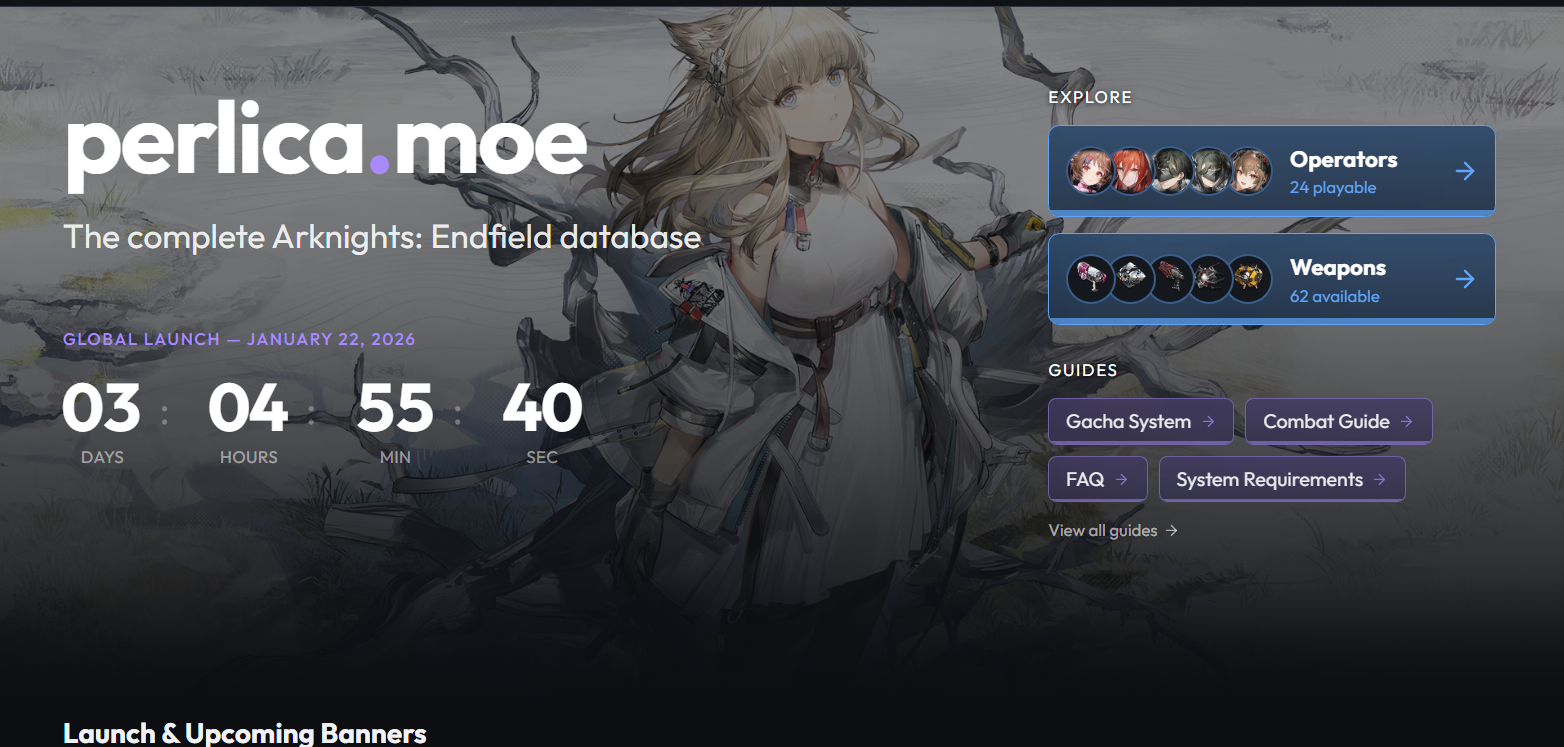 Previous thread: >>554291239>Special Endfield Launch Streamhttps://www.youtube.com/watch?v=dz2g_D52NR0>LAUNCH DATE AND TIMES:January 21st05:00 PM (Los Angeles, PST)07:00 PM (Chicago, CST)08:00 PM (New York, EST)January 22nd01:00 AM (London, GMT)02:00 AM (Berlin, CET)04:00 AM (Riyadh, UTC +3)09:00 AM (Beijing, GMT +8)10:00 AM (Tokyo, UTC +9)12:00 PM (Sydney, AEDT)>Platforms/Where to Download (Pre-Download starts on January 20th, UTC +8)Windows/PC - Epic Games Store and standalone launcherAndroid - Google Play StoreiOS - App StorePlayStation 5 - PlayStation Store>Official Endfield Website (PRE-REGISTER HERE)https://endfield.gryphline.com/en-us>Official EN X (NEWS HERE)https://x.com/AKEndfield>Launch Reward CodesValid from Release to January 29th, 11:59 PM (UTC +8) (Redeem in-game and receive through in-game mail)RETURNOFALLALLFIELD>Voyage to the Stars (Special event to launch your name into space)January 16th, 09:00 PM (UTC +8), to March 4th, 11:59 PM (UTC +8)https://endfield.gryphline.com/activity/voyage-to-the-stars/en-us/>Official Release Trailerhttps://www.youtube.com/watch?v=oJ00ggFb8A0>Official Release PV'shttps://www.youtube.com/watch?v=5Xm45NwWOlohttps://www.youtube.com/watch?v=UPpeeft1-8ohttps://www.youtube.com/watch?v=tN80M6IEMo0>f2p?Yes, on all platforms, but you can buy an optional launch bundle on the PS5 for $9.99.>Unofficial Wikishttps://warfarin.wiki/enhttps://perlica.moehttps://endfield.wiki.gg/>System Requirementshttps://perlica.moe/system-requirements>Operators (Playable characters)https://warfarin.wiki/en/operators>Stickershttps://drive.google.com/drive/folders/13KH3L6QPIKkVH7pBddv4uxwmwJsnOtklhttps://drive.google.com/drive/folders/1OuVtjv1k-9c3M6n7d4PX3CGG5bkwH04ahttps://drive.google.com/drive/folders/1AStB8bzFk3lSwMwczWPkFYCBrZe0vHOghttps://drive.google.com/drive/folders/1yS0lqUhxf8tBRtpDFfCU1y16IS2sSeF7