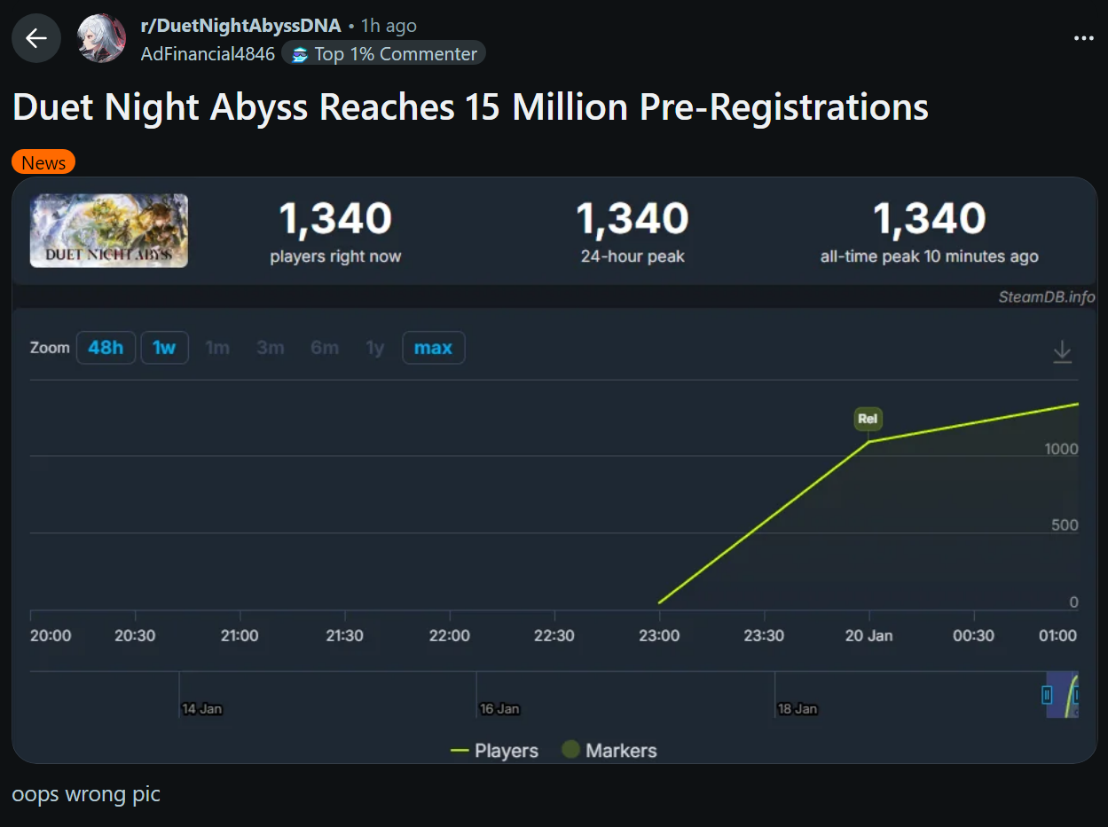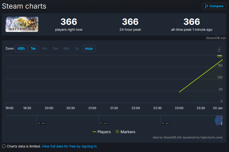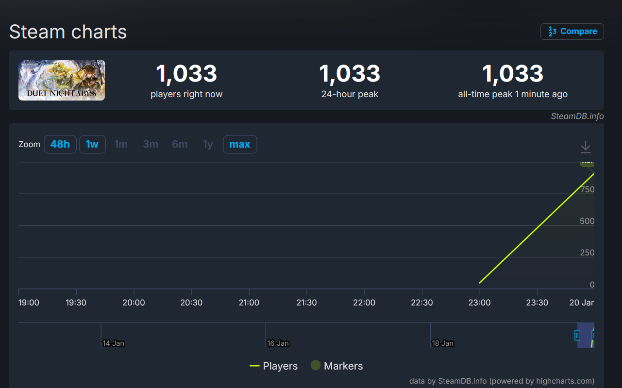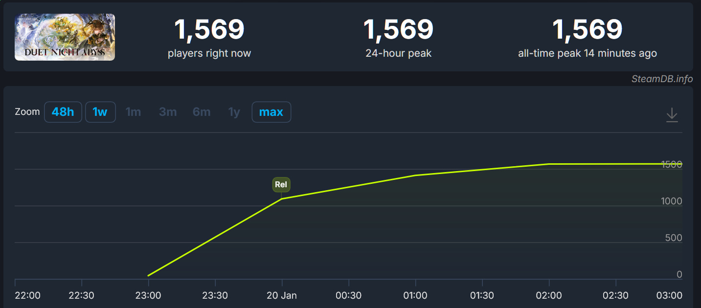 >>554499465Nah, long term growth is not concerned with launch day numbers, much less hourly trends on launch day. If they're hoping for long term growth, what they hope for is an active enough playerbase that sticks around after v1.2 and beyond. While spending enough to at least keep development active.Warframe took about a year after launch before their concurrent user count noticeably increased. Then another few years before they could start hitting 100k+ player peaks. If Pan wants to follow their footsteps, these next patches better be good enough to maintain the current playerbase then maybe start growing in about a year after enough improvements.