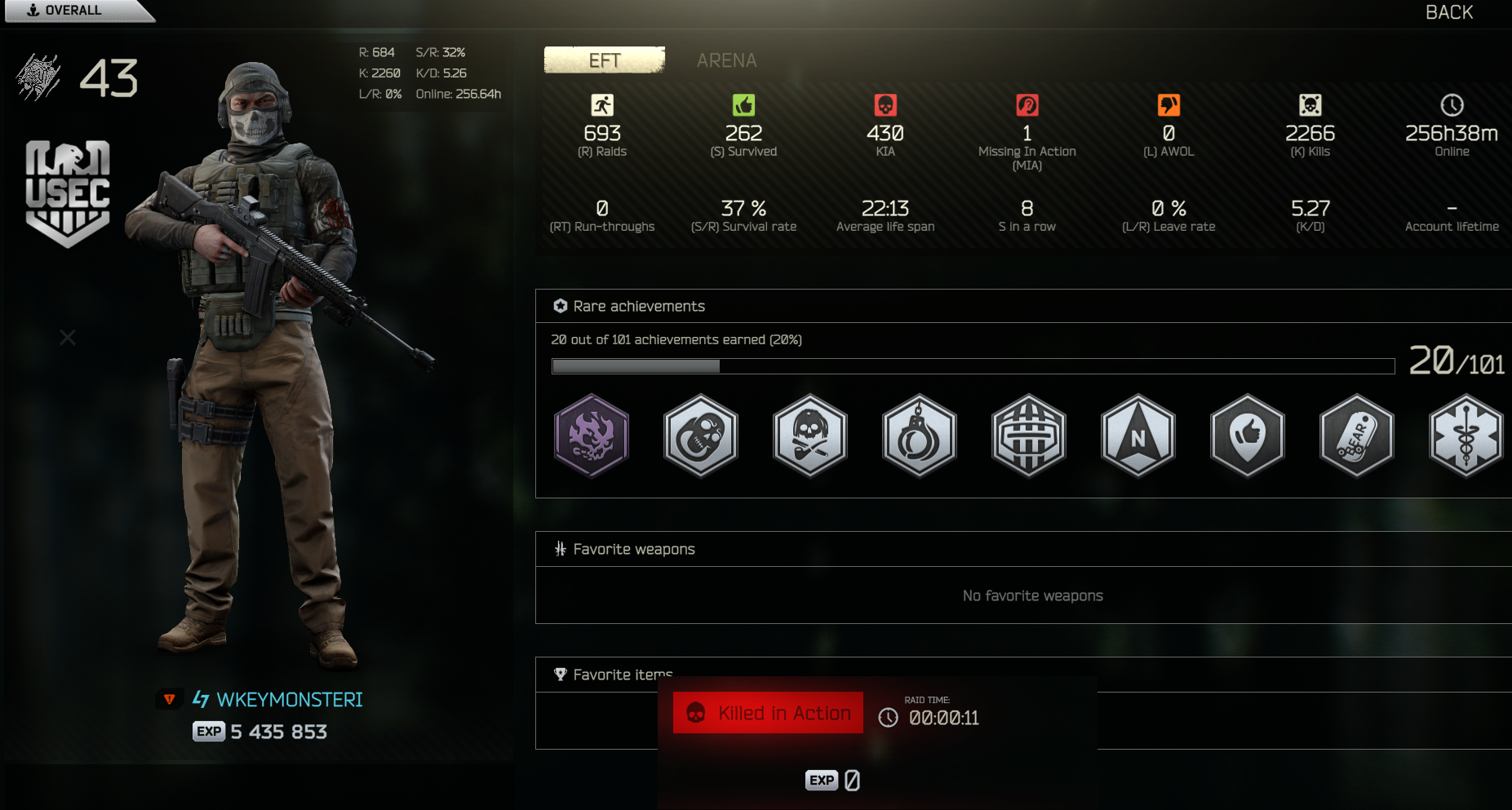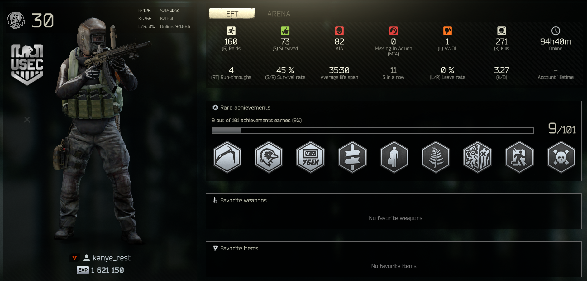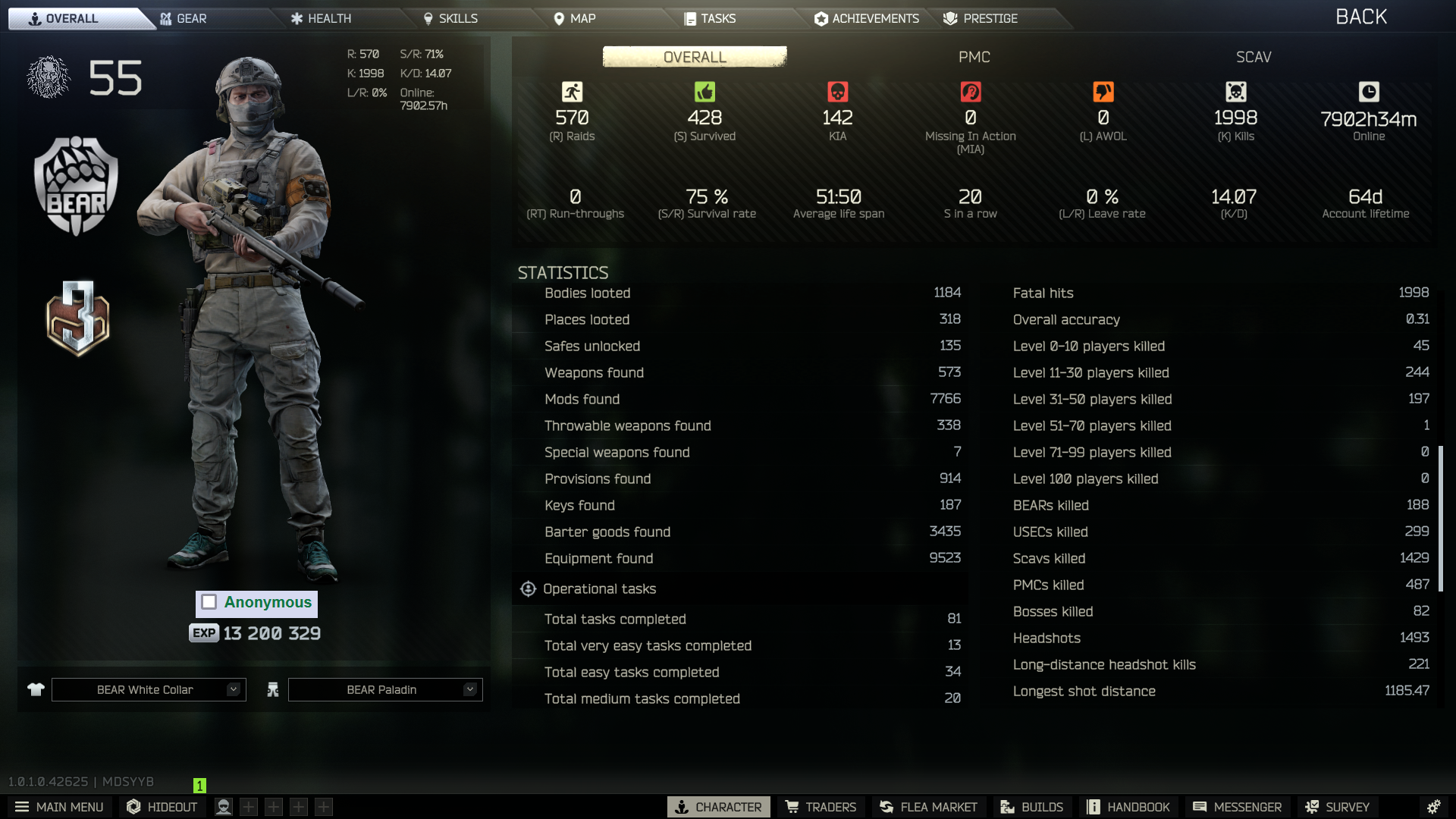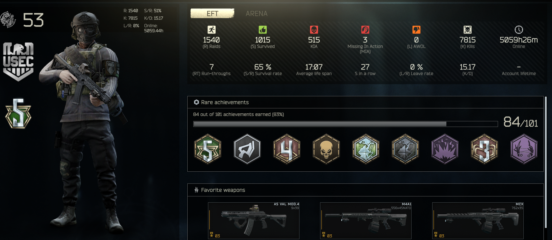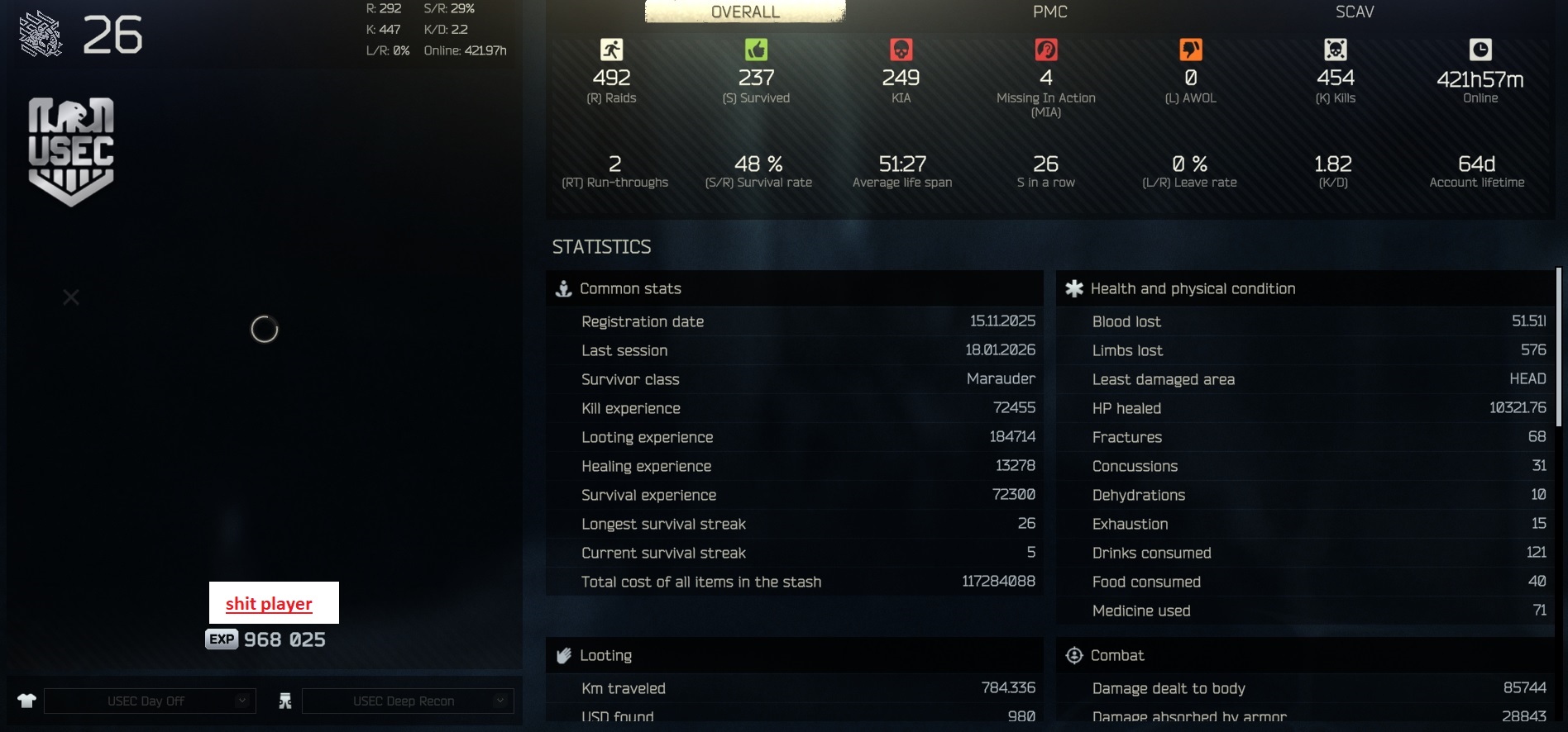 stat check. picked this game up, well, 45 days ago, evidently. lots of my online time is idle or scavving but i have been playing every day for a few hours at least since then. am i at or at least near where i should be as a timmy? keep in mind that my s/r is probably inflated because i am only really playing factory, customs, woods, and GZ. once i start learning more maps i expect it to tank significantly. only 41 of those kills are PMCs, for the record.