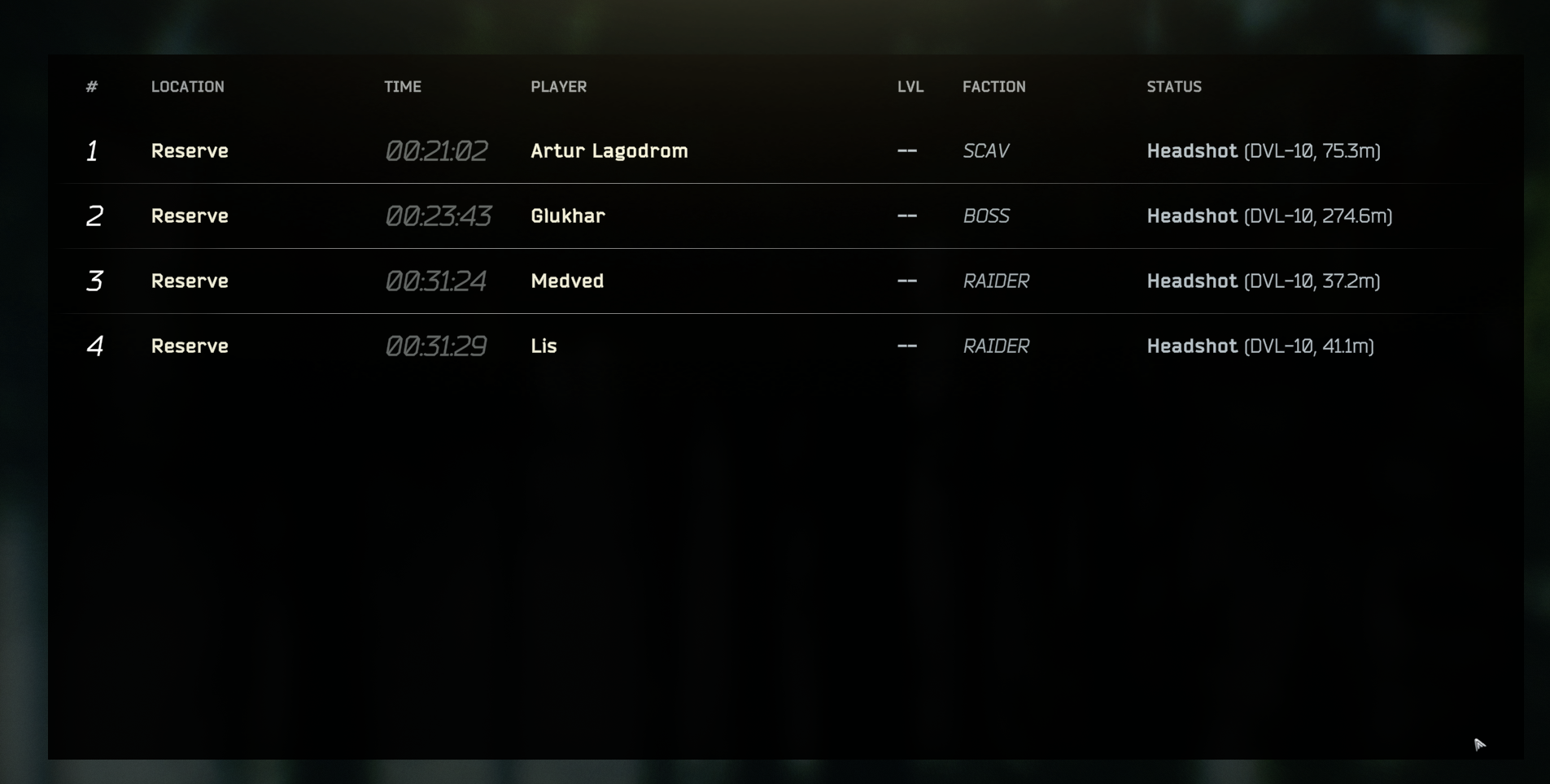 >>554331642reserve is also pretty good u can just take a pistol and a bag full of smoke nades and start throwing them at 25 mins and some pscav will surely come check it out