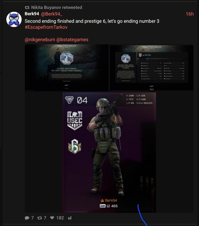 >>554391050I would say I was about here. I was solo, I heard the fighting saw the fresh body and posted up. it was a gay angle that can only see the body and can only be seen when next to the body. First guy had no real reason to think anyone was watching. For some reason they thought the guy they killed had a buddy though. >>554393007I ripped up the guns. Did not get the helmet but i got the 2000 Euro super ear plugs. I truly don't understand how you can call someone with a normal account a cheater because you died to them standing still looting your buddies body that just died in the same way. I guess the average stats and blueberry outfit were humiliating. Looking me up on tarkov dev and "analyzing" my achievements had my sides in orbit.