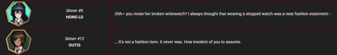 >>554328852>>554329387but Outis's watch is visibly broken, and has been since the warthat's her main continuity item, like ishmael's hairband or heath's ring