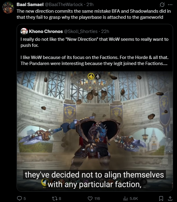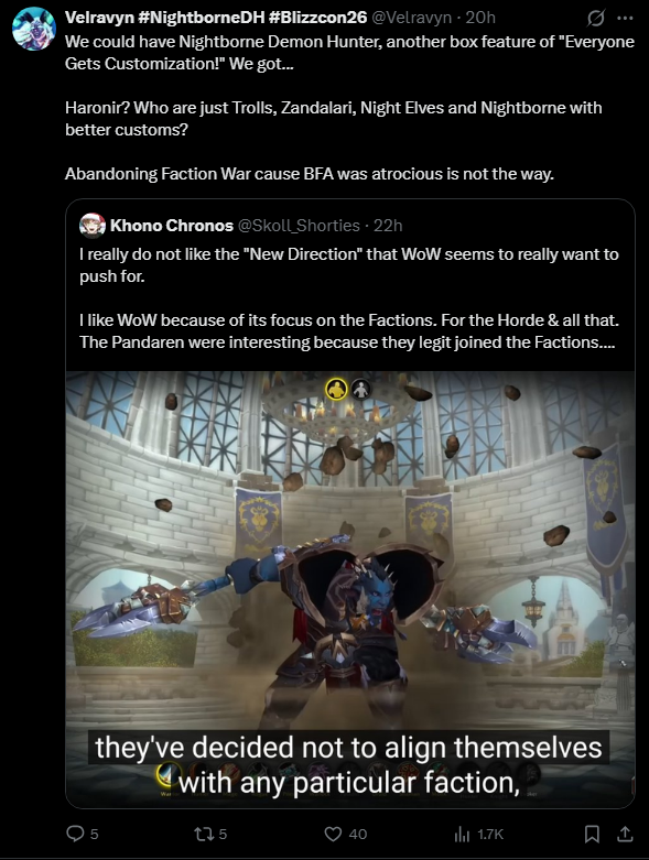 >have enough self-awareness to know that the average normalfag thinks of orcs when they see Warcraft>orcs barely exist in the game anymore and the only notable orc character that gets more than 3 minutes of screentime per expansion is a generic literal who that exists to be a pet for humansOne of those things that the average person can identify the problem of in a few minutes but multi-billion dollar companies can't see the issue because they have to run it through 40 middle managers first