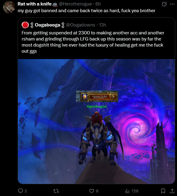 >>554380182- but it isn't alwaysnow there are a few accomplishments that no one is going to try to ego you overthats rank 1 in pvp, not blitz tho because its a literal meme bracket where perma rivals can get the rank 1 title, it is a complete coinflip bracket that no one with any stake in the game takes seriouslyHall of Fame CEand Mythic Plus titleand so basically with those cheevos the only people that will ego you are people higher on the ladder than you like Petkick, people in a higher world rank guild than you, and people that claim you bought keys or sucked people off to get into those keys and that you were basically carried, but if they don't have the title and no one ratted you out its not going to be given and degree of validation