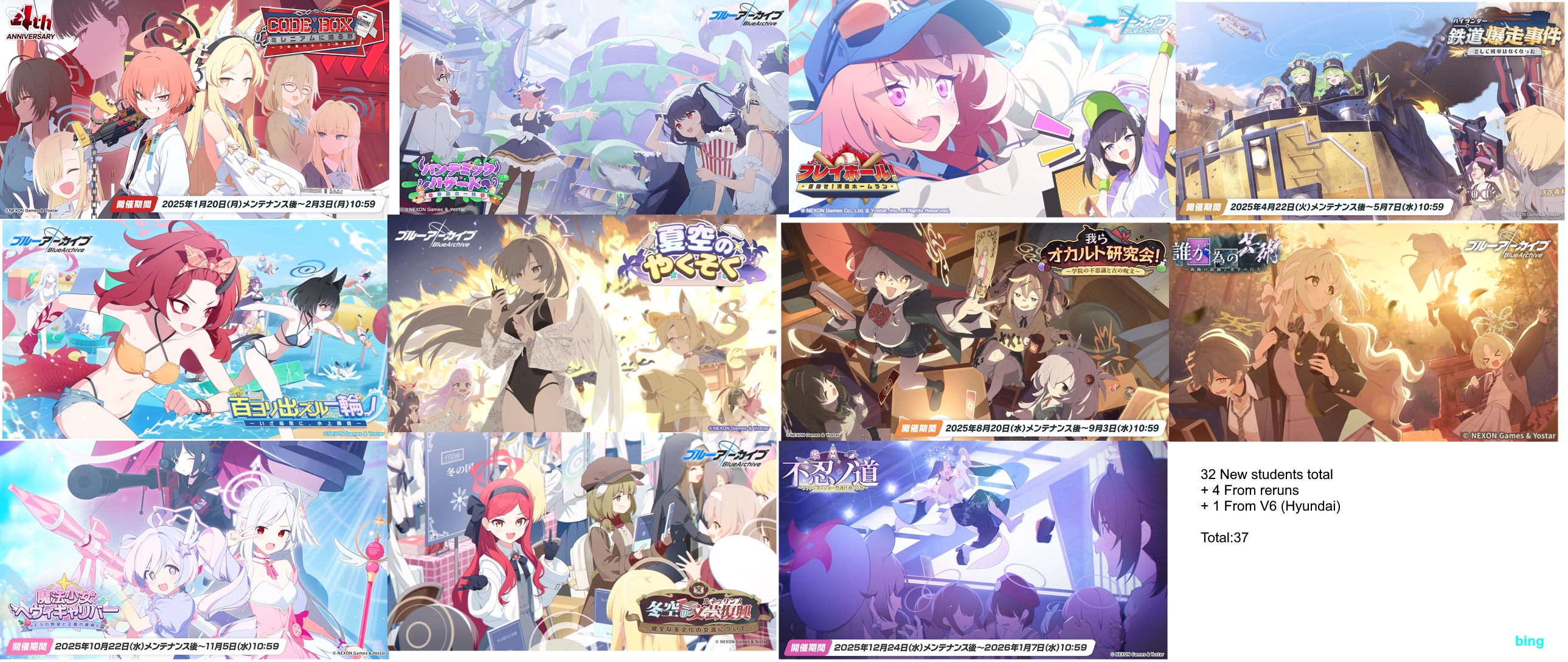 Previous Thread: >>554347821>Guides, Resources and useful links:https://rentry.org/bagguides>/bag/Circles/Clubs/Friends:https://rentry.org/holdingthebag>4koma, Manga, Side Content, PVs & Shortshttps://rentry.org/bacontent>>(JP) – JST>Banners:>1/7 After Maint – 1/20 10:59KisakiReijoYuuka (Track) (Limited)Mari (Track) (Limited)>5th Anniversary Livestream:Day 1: https://www.youtube.com/live/mdafTit0lTA – 1/17 10:00 – 18:00Day 2: https://www.youtube.com/live/kgCwc2EHDgY – 1/18 10:00 – 18:00>News:5th Anniversary Website: https://5th-anniversary.bluearchive.jpPatch notes: https://bluearchive.jp/news/newsJump/618>Events:The Senses Descend – 1/7 After Maint – 1/20 10:595th Anniversary Countdown Login Bonus Event – 1/13 4:00 – 1/20 3:59>Content:Grand Assault: ShiroKuro (Urban – Torment w/Special & Elastic Armor) – 1/14 11:00 – 1/20 3:59Limit Break Assault: The Fury of Set (Field – w/Light Armor) – 12/25 11:00 – 1/20 3:592x Scrimmage/Commission – 1/14 4:00 – 1/20 3:59>>(GLOBAL) – UTC>Banners:>1/13 After Maint – 1/27 1:59EriKanoe>News:Patch notes: https://forum.nexon.com/bluearchive-en/board_view?thread=3336837>Events:We Are the Occult Investigation Society! Ancient Spells and Mysteries – 1/13 After Maint – 1/27 1:59My Office: https://bluearchive.nexon.com/user/myoffice>Content:Total Assault: Perorodzilla (Field) – 1/20 2:00 – 1/26 18:59Joint Firing Drill (Shooting) – 1/27 2:00 – 2/2 18:59Limit Break Assault: Chokmah (Field – w/Special Armor) – 1/14 2:00 – 2/9 18:592x Bounty – 1/12 19:00 – 1/19 18:592x Account EXP – 1/16 19:00 – 1/18 18:592x Normal – 1/19 19:00 – 1/26 18:592x Account EXP – 1/23 19:00 – 1/25 18:592x Lesson/Scrimmage – 1/26 19:00 – 2/2 18:59