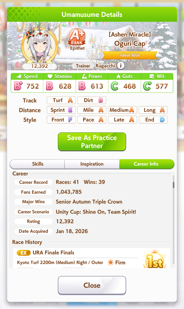 Previous: >>554349706>Global Game NewsLink your account to Cygames iDCurrent Scenario: Aoharu Hai aka "Unity Cup"Current Rate Up Trainee: Christmas Oguri Cap (3* alt), Christmas Biwa Hayahide (3* alt), Fine Motion (3*)Current Rate Up Support Cards: Narita Taishin (SSR), Mayano Top Gun (SSR), Manhattan Cafe (SSR), Inari One (SR)01/19 - Sagittarius Cup - Nakayama Turf 2500m01/22 - Tama 3*+Neicha SSR+Ogurin SSR - Legend Races01/27 - New Beginnings Part 101/29 - NY Opera & Haru 3*+Fuku SSR+Ayabe SSRMid February - Capricorn Cup - Chukyo Turf 1200mhttps://umamusume.com/news/100040/https://pages.snep.pw/uma/anni-skill-changes/>JP Game NewsCurrent Rate Up: Bubble Gum Fellow (3* Alt), Stay Gold (3*), Gentildonna (3*), Orfevre (3*), King Halo (SSR), Satono Diamond (SR)New Scenario "Yukoma Hot Spring" releasedTimeline: https://uma.moe/timelineCygames Webstore: https://webstore.cygames.com/en/umamusume_en/>Thread Clubshttps://rentry.co/umaglobalclublistYou must be E3 (20k points) to join a circle. Apply with /uma/ or /vg/ in your profile or post ID in the thread.>All Guides & Resourceshttps://rentry.org/uma26Game databasehttps://gametora.com/umamusume (Click the gear to switch between JP / global server info)A basic guide for newfagshttps://rentry.org/umaglobalFind networks if your region is blocked from the game or clienthttps://www.umavpn.top/93Seiyuu & Concertshttps://rentry.org/umstUma Texthttps://umareader.idsmile.xyz/