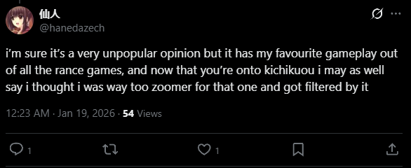 >>554418098>>554418348Post about eroge and be racist on Xitter if you want to get into ones that aren't pozzed