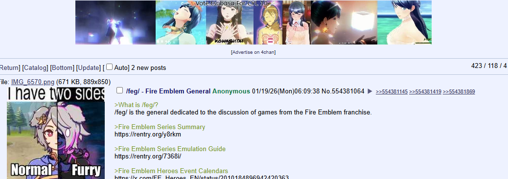 >What is /feg/?/feg/ is the general dedicated to the discussion of games from the Fire Emblem franchise.>Fire Emblem Series Summaryhttps://rentry.org/y8rkm>Fire Emblem Series Emulation Guidehttps://rentry.org/7368i/>Fire Emblem Heroes Event Calendarshttps://x.com/FE_Heroes_EN/status/2010184896942420363>Fire Emblem Heroes Links and Guideshttps://pastebin.com/TguPqnsT>Latest FEH Trailerhttps://youtu.be/IkxrT8tUpLo >Latest FES trailerhttps://youtu.be/bF5JuqwbOYk >Fire Emblem: Fortune's Weave Trailerhttps://youtu.be/j6eNaiftiWE >Choose Your Shadowhttps://vote10.campaigns.fire-emblem-heroes.com/en-US/shadows>/feg/ National Anthemshttps://youtu.be/_2i6ARd5SD4 https://voca.ro/1ejOOgmzSwymPrevious: >>554193614
