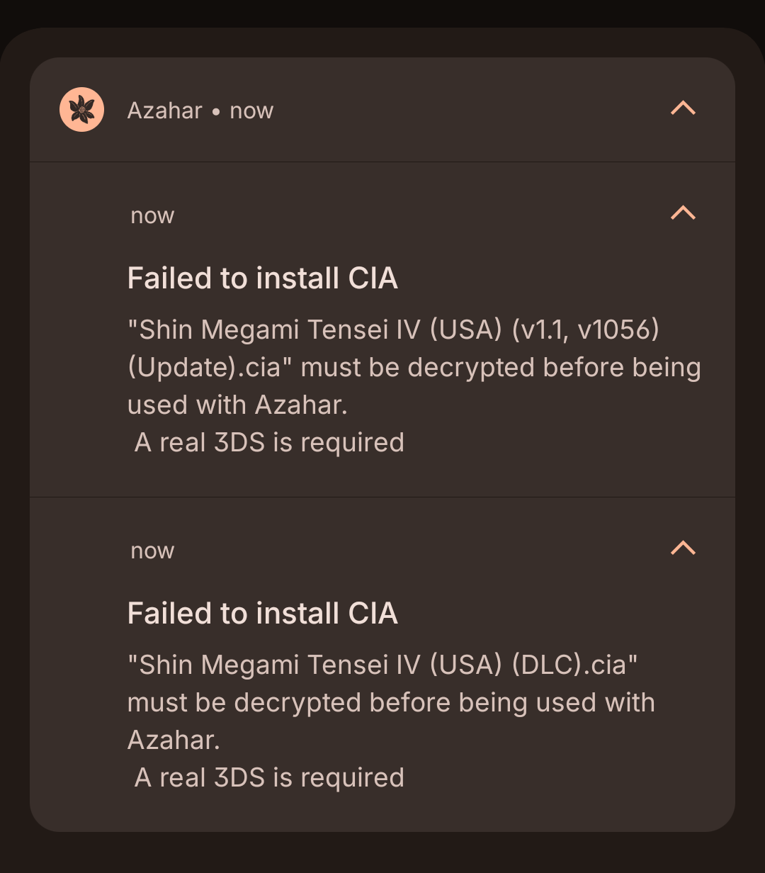 I can't install update and DLC in Azahar. Does anyone know how to fix this?