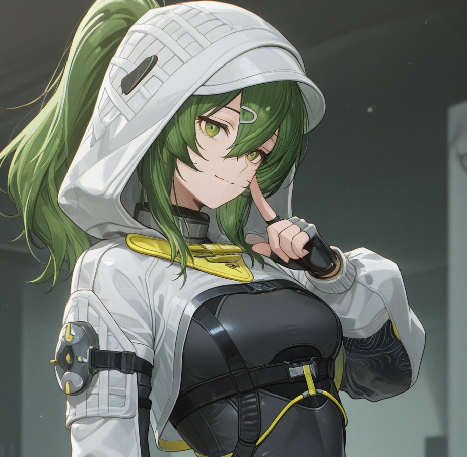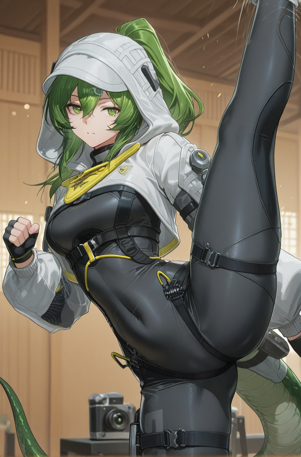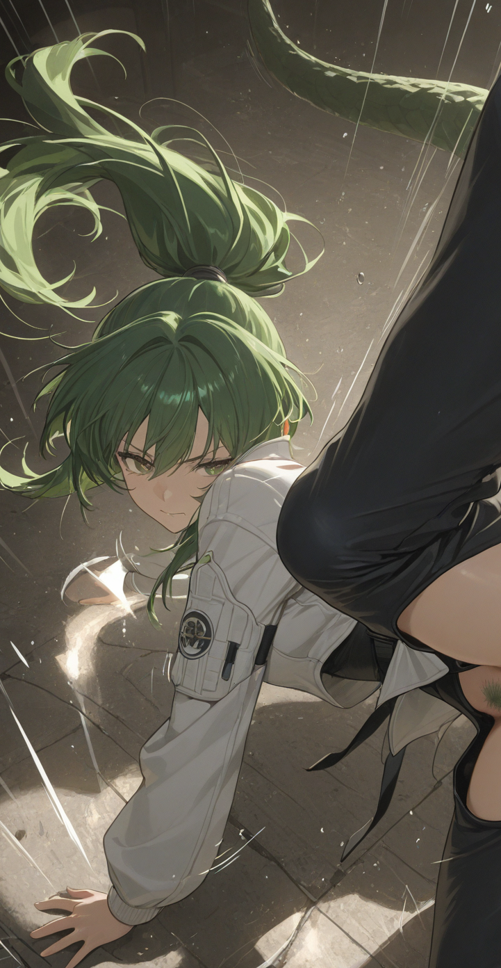 > Fluorite, fluorite, 1girl, green hair, green eyes, long hair, ponytail, crocodilian tail,
