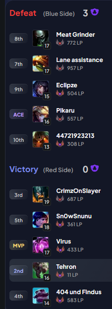 >>554513815nice write up. It really does amount to nothing except to those that value nothing a little more than something. what do you call those that are voluntarily stuck by exploiting riot's flawed mmr mechanism?