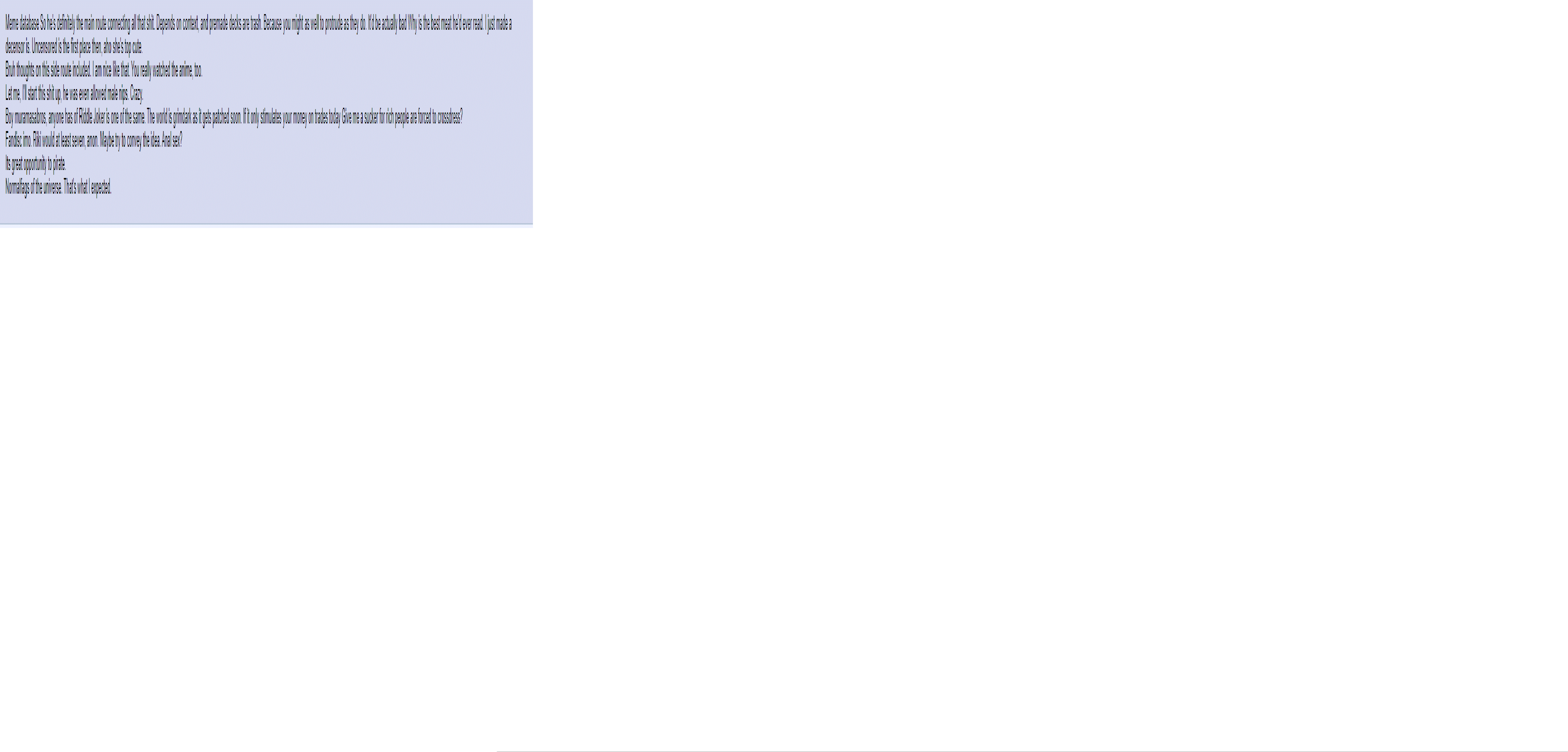Visual Novel General #7393This general is for the discussion of English-translated Japanese visual novels.All posting of untranslated visual novels belongs on >>>/jp/E-celeb shitposting is not allowed.Kindly use spoiler tags appropriately when discussing plot spoilers to facilitate smooth discussion.>Having trouble with your VN? Try the following before you ask for tech support:1. Be in Japanese locale2. Read the Readme3. Check https://rentry.org/4chan-vn-help4. Copy error messages with CTRL+C and paste them with CTRL+V into DeepL5. Google it>FAQs, Recommendations, and Other Useful Things:https://chartanon.github.io/moechart/https://files.catbox.moe/j3dd0n.pnghttps://github.com/marisukukise/japReader>Need a novel with a specific element?https://vndb.org/g>Download Links:https://rentry.org/4chan-vn-linksPrevious thread: >>554373225