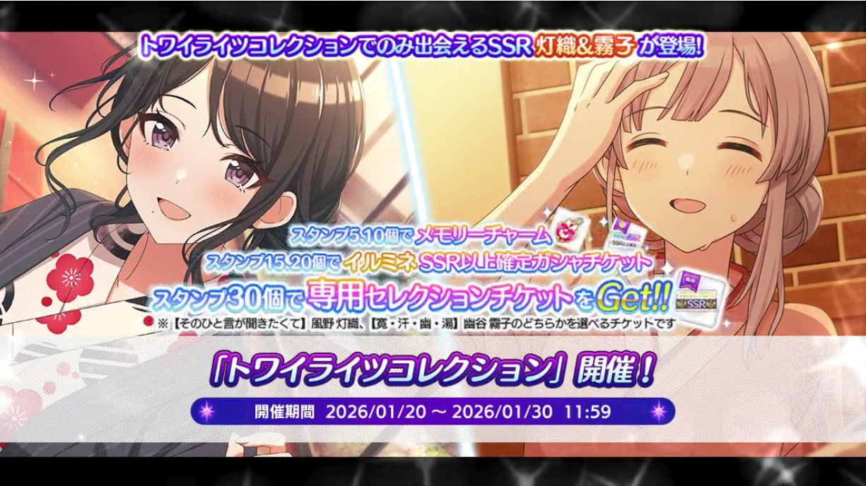 kirikirihiohiosweatysweatyTwicolleP-SSR【そのひと言が聞きたくて】Kazano HioriS-SSR【寛・汗・幽・湯】Yukoku Kirikohttps://twitter.com/imassc_official/status/2013493190725378231?s=20Gacha Animationhttps://twitter.com/imassc_official/status/2013493726640062873?s=20