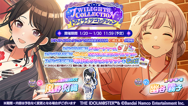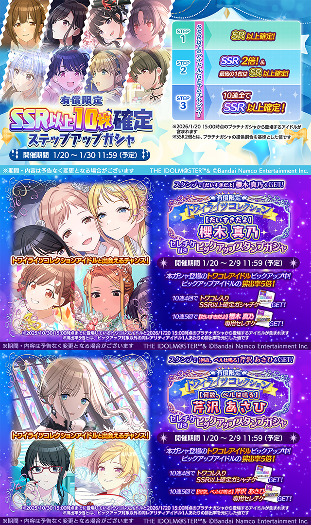 Paid Jewel 10 Guaranteed SSR+ Step-Up Gacha:https://twitter.com/imassc_official/status/2013492436065231057?s=20Paid Jewel Twicolle Mano Select Ticket Stamp Gachahttps://twitter.com/imassc_official/status/2013492687752569033?s=20Paid Jewel Twicolle Asahi Select Ticket Stamp Gachahttps://twitter.com/imassc_official/status/2013492939767587081?s=20