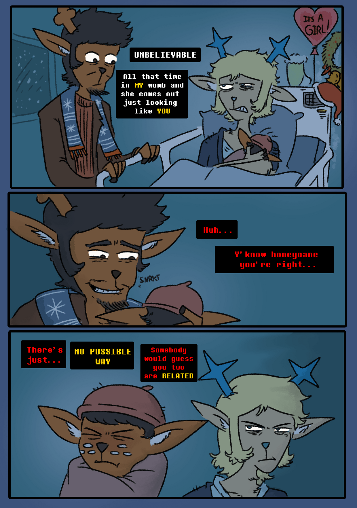 I think the Cattenheimers have the worst skeleton in their closet. They're presented as a perfect happy family with two loving parents that dote on their children and have an intact marriage, but something is very off. I think this is their purpose in the plot, to be the family that actually did the worst shit while the Dreemurrs and Holidays are going to be shown to be flawed but significantly more redeemable. Something fucked resulted in cat dad's arm being removed.