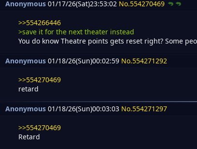 >>554507514>Damn it was literally the next 4 responsesI have the thread on auto-scroll and rarely ever read up since most posts are schizos baiting for attention