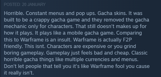 >want to earnestly criticise the game>have to stand side by side with actual genuinely delusional subhumans who are Gacha PVPers that use their 1 hour of warframe time as leverage against the game>have to stand side by side with subhumans who actually give a fuck that the meow cat bow doesn't have a drawstring>have to stand side by side with subhumans who have literally never played a non gacha game or non robloxIt's suffering really.