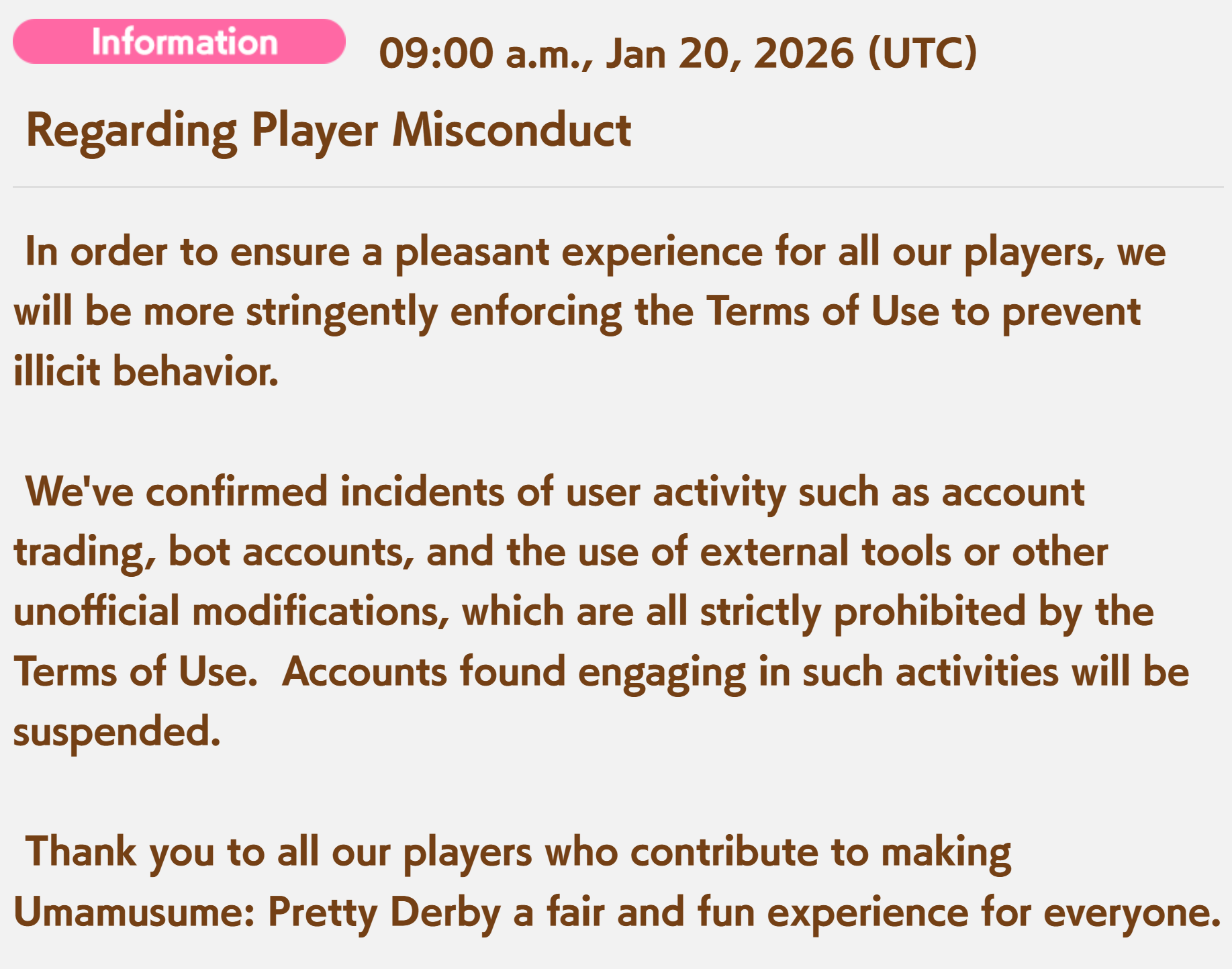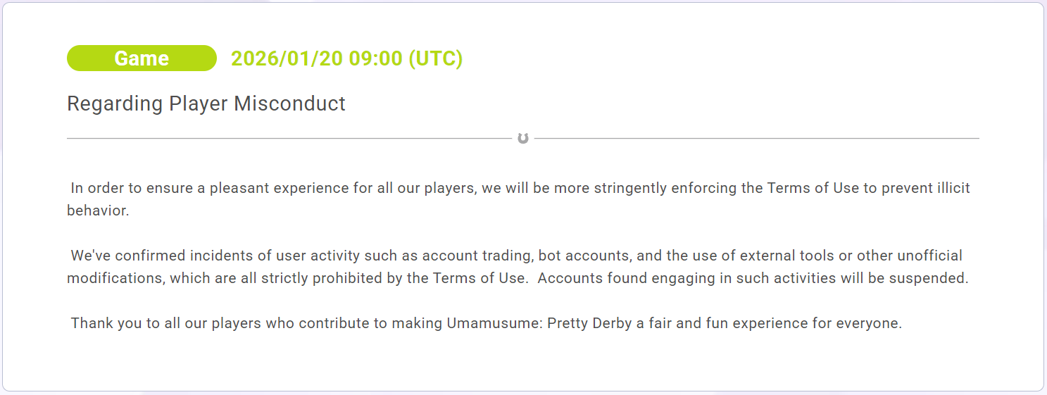 >>5545187981/3Subject: Sincere Apology and Appeal Regarding Account Suspension for Bot UsageDear Cygames Support Team,I am writing to express my profound shame, regret, and unconditional apology for my inexcusable actions that led to my account being banned for bot usage.I fully admit that I violated the terms of service by using unauthorized automation tools (bots/macros) in Uma Musume. There is no excuse for this behavior. I knowingly and deliberately broke the rules that exist to ensure fair play and protect the integrity of the game for all players. My actions were selfish, disrespectful to the developers who poured their hearts into creating this experience, and unfair to every honest player in the community.I deeply regret the damage I caused to the game environment and to the trust you place in your players. I now clearly understand how such third-party tools undermine the spirit of competition, ruin the enjoyment of others, and disrespect the immense effort your team invests in maintaining a balanced and enjoyable game.I take full responsibility for my misconduct with no attempts to shift blame or make excuses. I was wrong — completely and unambiguously.I humbly beg for your mercy and a second chance. If you see fit to reinstate my account, I solemnly promise:I will never again use, download, or even consider any form of bot, script, macro, or unauthorized third-party software.I will play strictly according to the rules and terms of service.I will respect the game, its community, and your company's hard work moving forward.