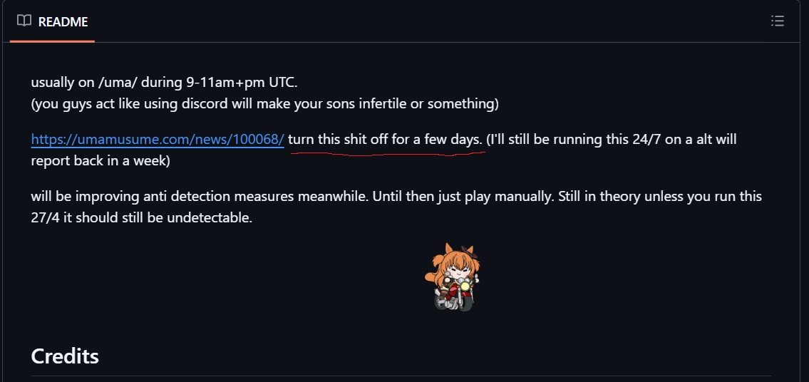 holy shit bros I'm actually shaken by the news fuck fuck fuck fuckI just realized that if I got banned I'd probably kill myself holy shit I fucking love uma so much it's the only one I have right nowfuck why did I even try botting in the first place holy shit I feel like killing myself now I don't think I can live without teio yapping on my homescreen