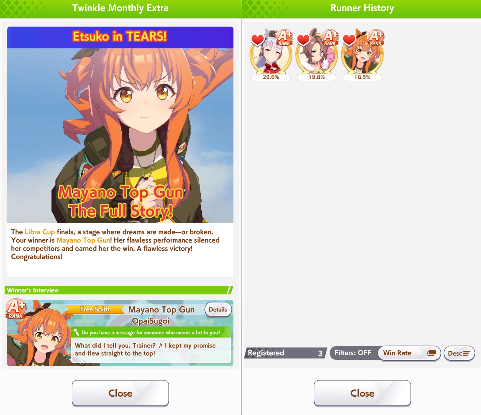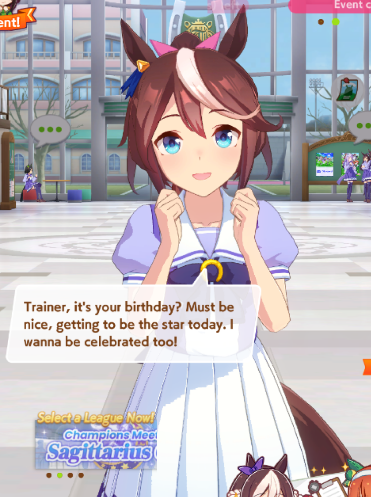 Previous: >>554501137>Global Game NewsLink your account to Cygames iDCurrent Scenario: Aoharu Hai aka "Unity Cup"Current Rate Up Trainee: Christmas Oguri Cap (3* alt), Christmas Biwa Hayahide (3* alt), Fine Motion (3*)Current Rate Up Support Cards: Narita Taishin (SSR), Mayano Top Gun (SSR), Manhattan Cafe (SSR), Inari One (SR)01/19 - Sagittarius Cup - Nakayama Turf 2500m01/22 - Tama 3*+Neicha SSR+Ogurin SSR - Legend Races01/27 - New Beginnings Part 101/29 - NY Opera & Haru 3*+Fuku SSR+Ayabe SSRMid February - Capricorn Cup - Chukyo Turf 1200mhttps://umamusume.com/news/100040/https://pages.snep.pw/uma/anni-skill-changes/>JP Game NewsCurrent Rate Up: Bubble Gum Fellow (3* Alt), Stay Gold (3*), Gentildonna (3*), Orfevre (3*), King Halo (SSR), Satono Diamond (SR)New Scenario "Yukoma Hot Spring" releasedTimeline: https://uma.moe/timelineCygames Webstore: https://webstore.cygames.com/en/umamusume_en/>Thread Clubshttps://rentry.co/umaglobalclublistYou must be E3 (20k points) to join a circle. Apply with /uma/ or /vg/ in your profile or post ID in the thread.>All Guides & Resourceshttps://rentry.org/uma26Game databasehttps://gametora.com/umamusume (Click the gear to switch between JP / global server info)A basic guide for newfagshttps://rentry.org/umaglobalFind networks if your region is blocked from the game or clienthttps://www.umavpn.top/93Seiyuu & Concertshttps://rentry.org/umstUma Texthttps://umareader.idsmile.xyz/ITS MAMBOWARI DA