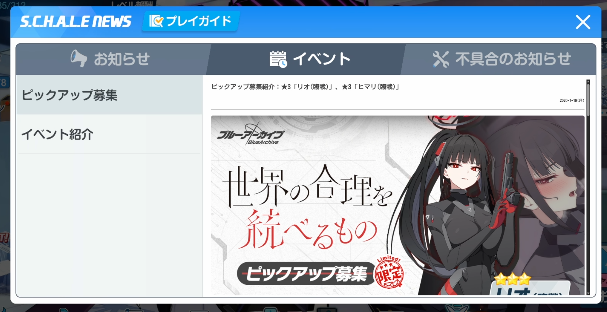 Previous Thread: >>554520323>Guides, Resources and useful links:https://rentry.org/bagguides>/bag/Circles/Clubs/Friends:https://rentry.org/holdingthebag>4koma, Manga, Side Content, PVs & Shortshttps://rentry.org/bacontent>>(JP) – JST>Banners:>1/20 After Maint – 1/29 10:59Rio (Battle – Limited)Himari (Battle – Limited)Toki (Battle – Welfare)>News:Patch notes: https://bluearchive.jp/news/newsJump/624>Events:Steel Continent Assault – 1/20 After Maint – 1/29 10:59100-Free Recruitment Event – 1/20 After Maint – 1/29 10:595th Anniversary Login Bonus – 1/20 After Maint – 2/12 10:59>Content:Limit Break Assault: Chokmah (Field w/Special Armor) – 1/21 11:00 – 2/12 3:593x Bounty/Normal/Hard – 1/20 4:00 – 1/25 3:592x Account EXP – 1/24 4:00 – 1/26 3:593x Commission/Lesson – 1/25 4:00 – 1/29 3:593x Bounty/Normal/Hard – 1/29 4:00 – 2/5 3:593x Commission/Lesson – 2/5 4:00 – 2/12 3:592x Account EXP – 2/7 4:00 – 2/9 3:59>>(GLOBAL) – UTC>Banners:>1/13 After Maint – 1/27 1:59EriKanoe>News:Patch notes: https://forum.nexon.com/bluearchive-en/board_view?thread=3336837>Events:We Are the Occult Investigation Society! Ancient Spells and Mysteries – 1/13 After Maint – 1/27 1:59My Office: https://bluearchive.nexon.com/user/myoffice>Content:Total Assault: Perorodzilla (Field) – 1/20 2:00 – 1/26 18:59Joint Firing Drill (Shooting) – 1/27 2:00 – 2/2 18:59Limit Break Assault: Chokmah (Field – w/Special Armor) – 1/14 2:00 – 2/9 18:592x Normal – 1/19 19:00 – 1/26 18:592x Account EXP – 1/23 19:00 – 1/25 18:592x Lesson/Scrimmage – 1/26 19:00 – 2/2 18:59