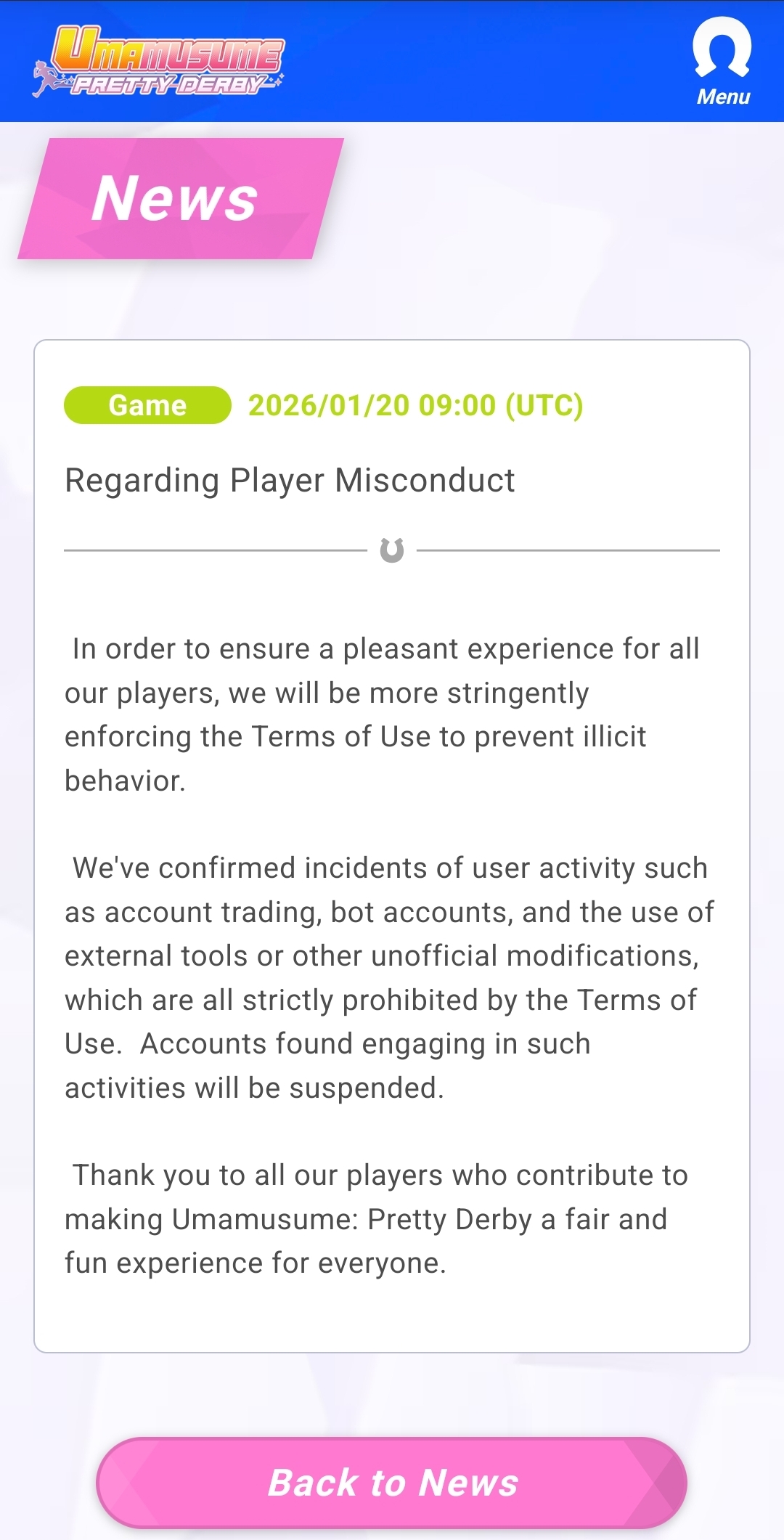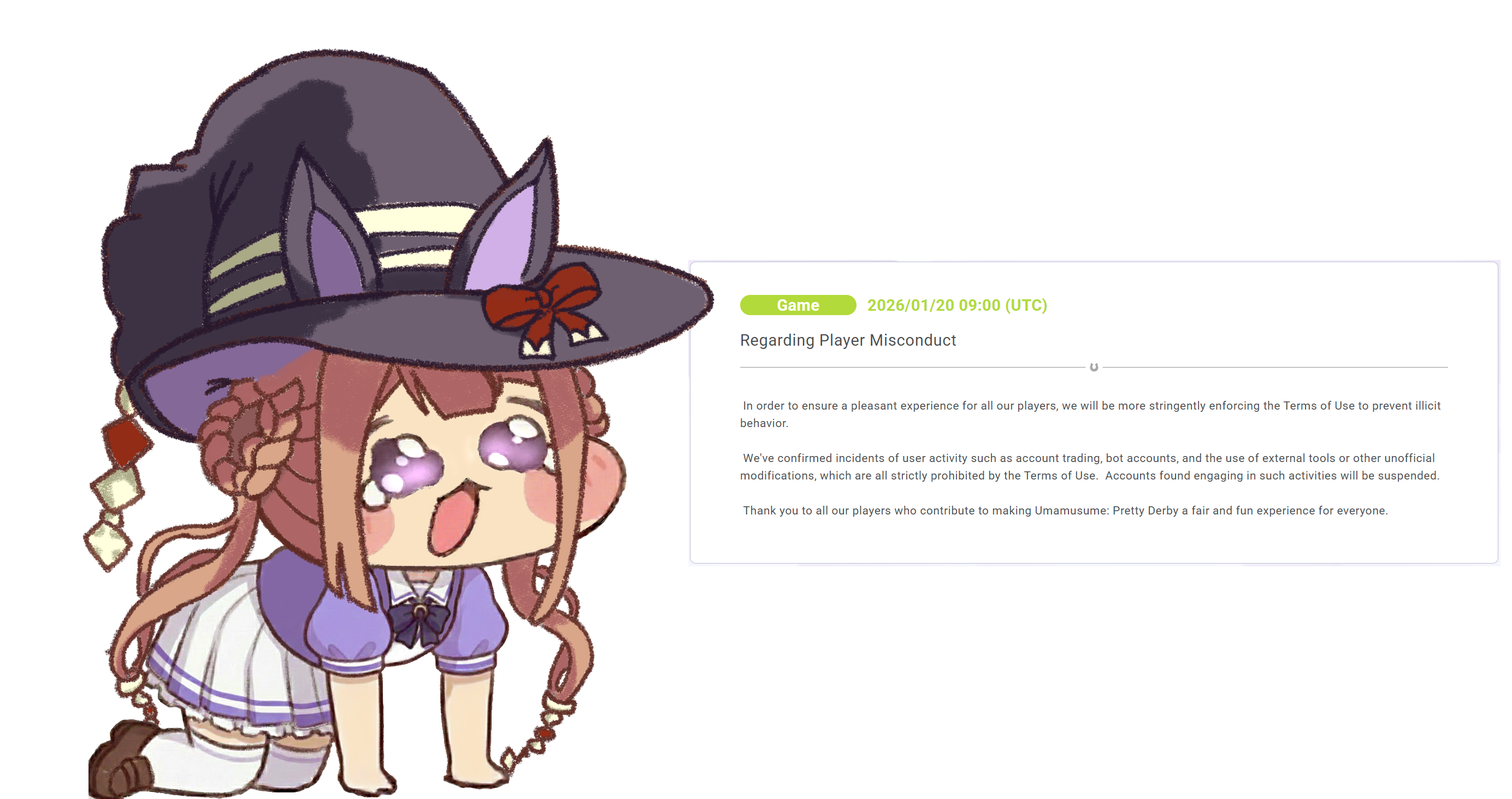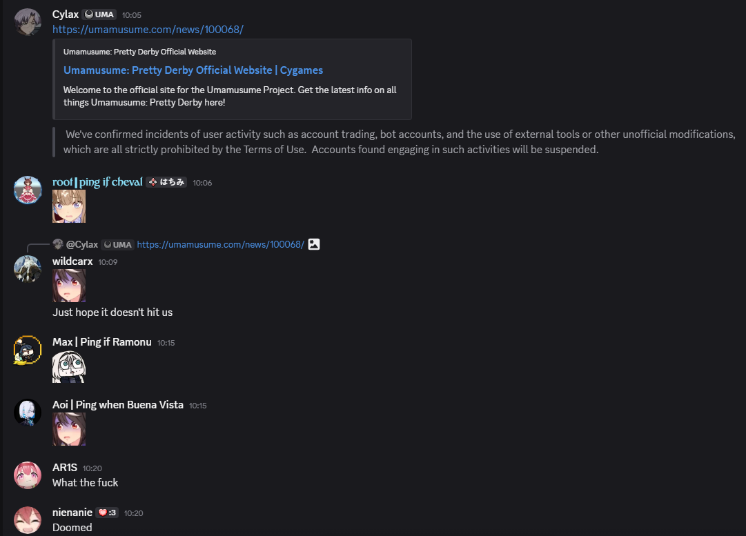 Jesus I just saw the Suzuka "hacker" clip off multiple platforms (fagbook, x/twitter, youtube) and they're all with more than 50k views each and 450k off alone just on youtube. Was this the cause of this sudden announcement? The farm botting went unnoticed for months but suddenly 3rd party tools or botting is a problem after this clip.