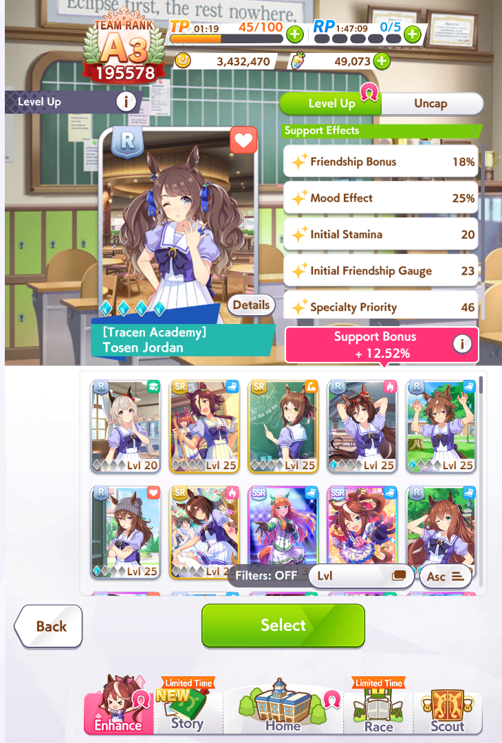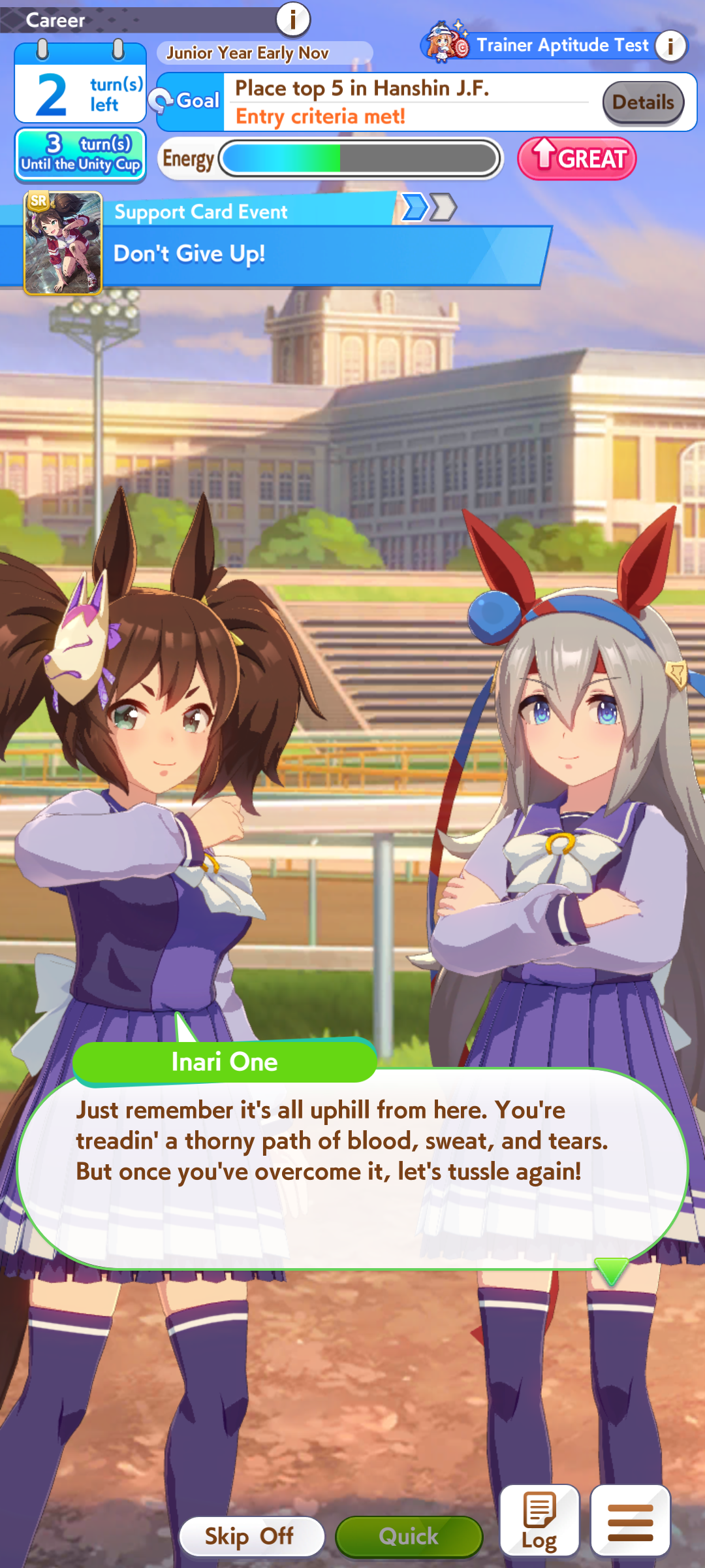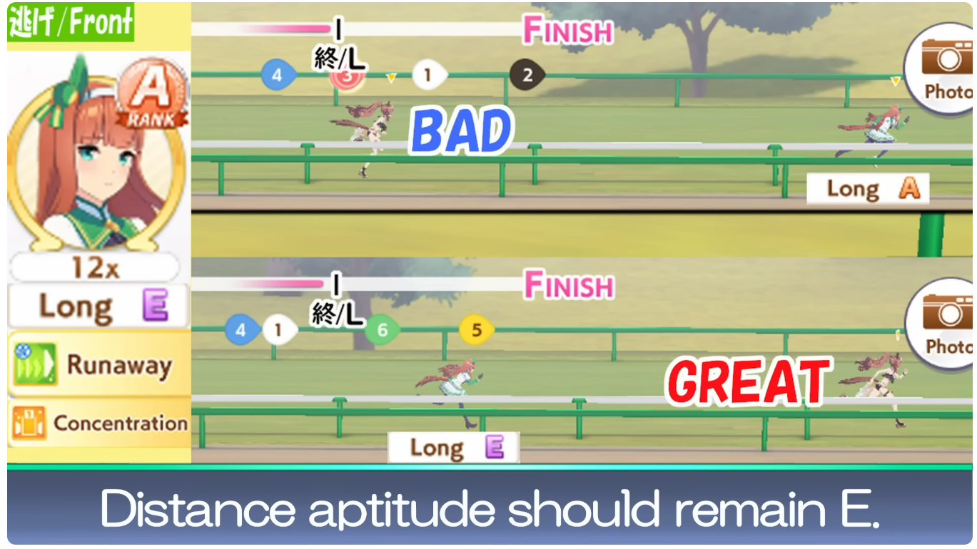 >>554536343Distance E reduces her initial acceleration (distance aptitude lower than D are similar to having low turf rating for accel). You can fine tune the overtake timing via her distance rating, power and wit, not via stamina.