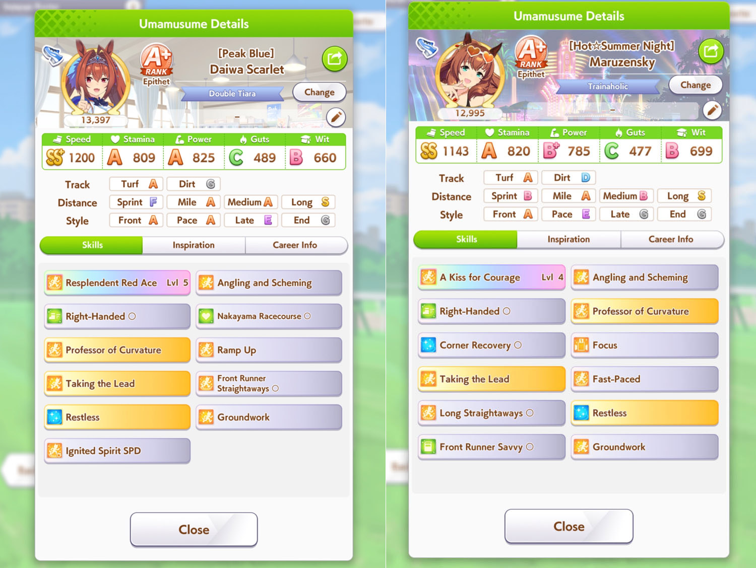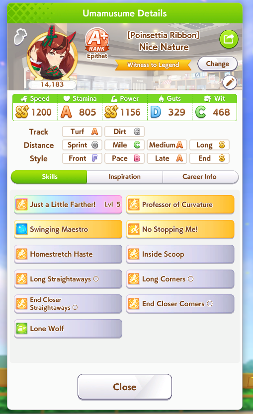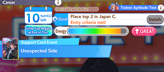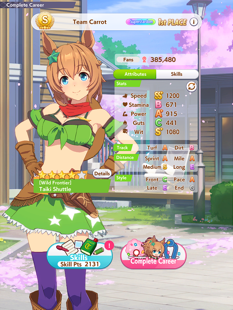>>554536343Distance E reduces her initial acceleration (distance aptitude lower than D are similar to having low turf rating for accel). You can fine tune the overtake timing via her distance rating, power and wit, not via stamina.