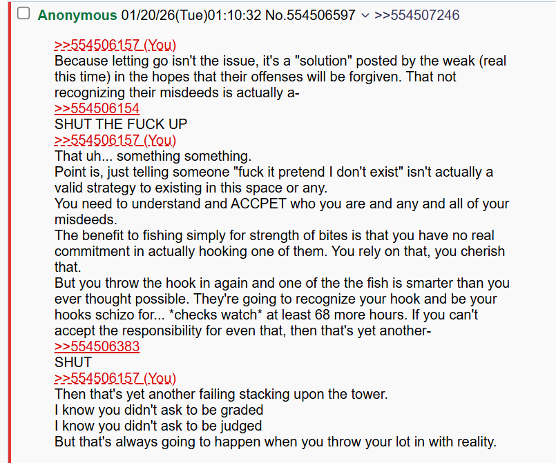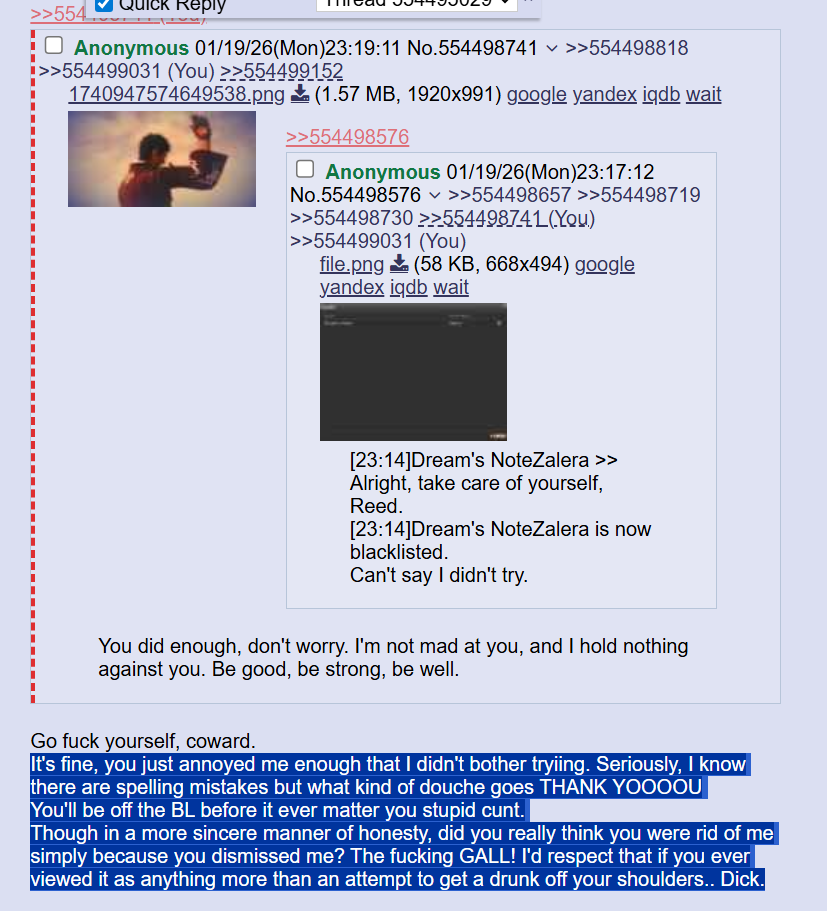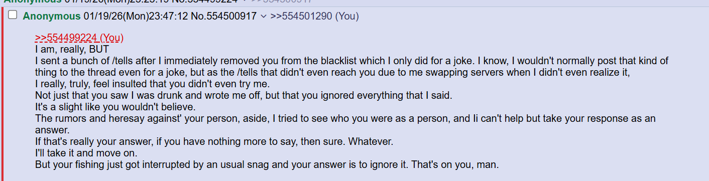 >>554544162If that was the last time you interacted with them then out of kindness I would personally give the benefit of the doubt and not post further at this point to save them more embarrassment.
